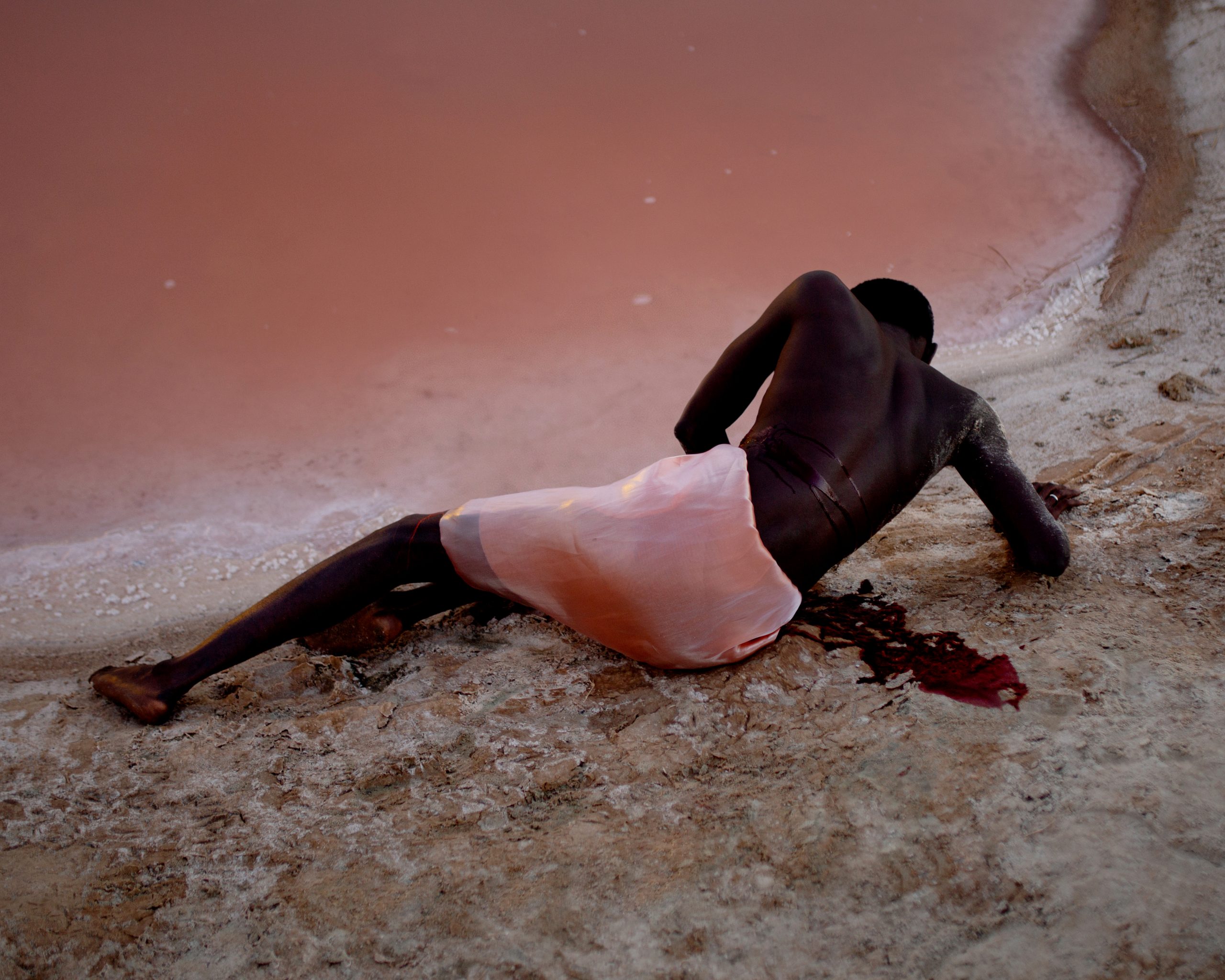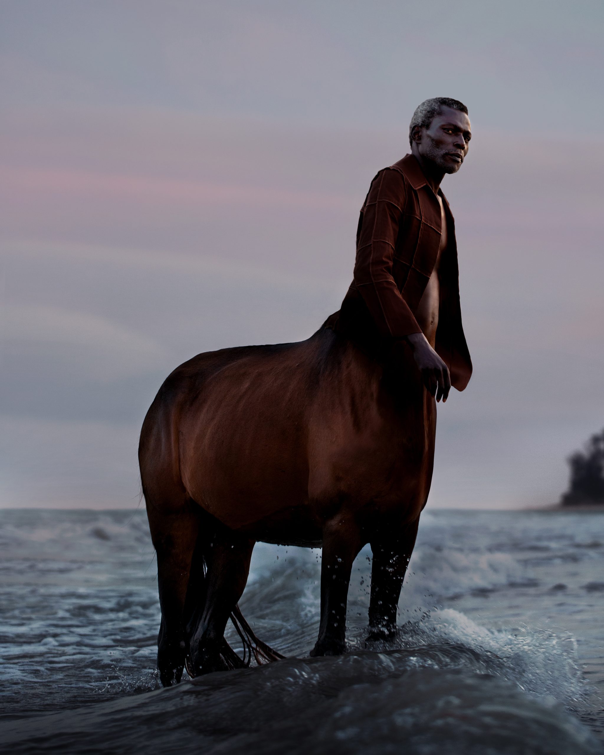 As with Okri’s writing, it’s this interplay between the natural and supernatural, between the visible and invisible that imbues Uzochukwu’s mages with an arresting presence. The ongoing series uses the image and ideas of Mami Wata (African/Black mermaids) “to explore both the historical relationship between the African diaspora and the water, and contemporary politics around migration.” A great part of the images were made in Senegal in 2018 and show mermen emerging from the seas protecting and healing one another. The most recent images came together in Germany and introduce a whole community of hybrid merfolk in states of solace and rebirth. An incubated baby, a proud centaur and a tender couple, among others, inhabit a boundless realm. Writing about the digital show for Unseen Magazine in an essay titled A Fantastic Turn, Ekow Eshun writes: