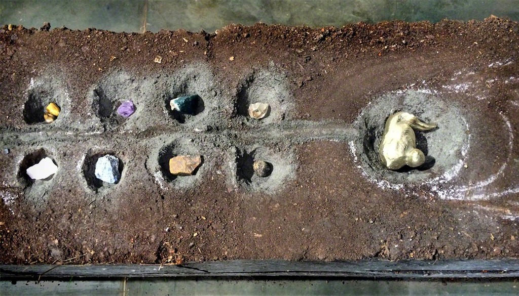 This installation is characteristic of how she webs together natural elements with man-made objects. Large masses of compacted soil were displayed in different parts of the gallery. On their surfaces were indentations and holes filled with shells, stones and gold, alluding to games such as Morabaraba and Diketo. The holes referenced voids, disruption in continuity and spaces to be filled. Rose petals, a candle, sage, clumps of clay with impressions of her hands, wool, charcoal and feathers were distributed across the surface of the soil. These masses of soil were displayed alongside projections of her hands holding and squeezing clay. This brings to mind earth as a source from which we extract materials, as well as its spiritual and cultural aspects. Her squeezing and molding clay highlights a key theme in her work; her concern with sovereignty both for the self and land. The actions she performs with her hands make flesh of ideas on land ownership and reclamation. Linked to this is her concern with the land as a container of memories and histories.
