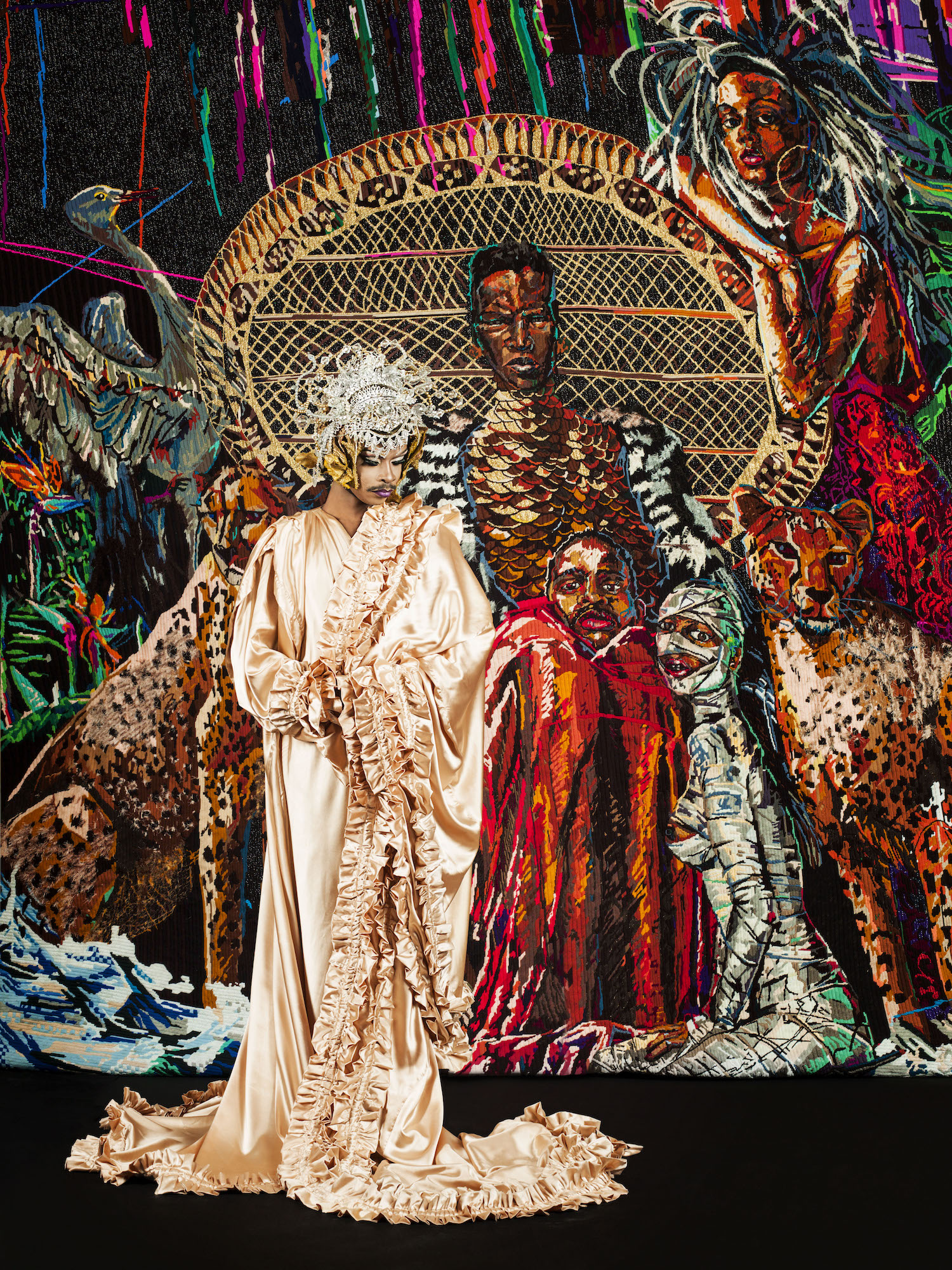 Of Gods, Rainbows and Omissions marks artist Athi-Patra Ruga’s first major solo exhibition in the UK. The show that is taking place in the South Wing of Somerset House holds the promise to unveil a dreamlike utopia of myth and its astonishing avatars. An amalgamation of three recent series is shown for the first time indicating his diverse practice. The show includes sculpture, drawing, handcrafted petit point tapestry, photography and film. “An allegory of post-apartheid political, cultural and social systems, and a shimmering vision of a more humanist future” immerses viewers in Ruga’s bright world.