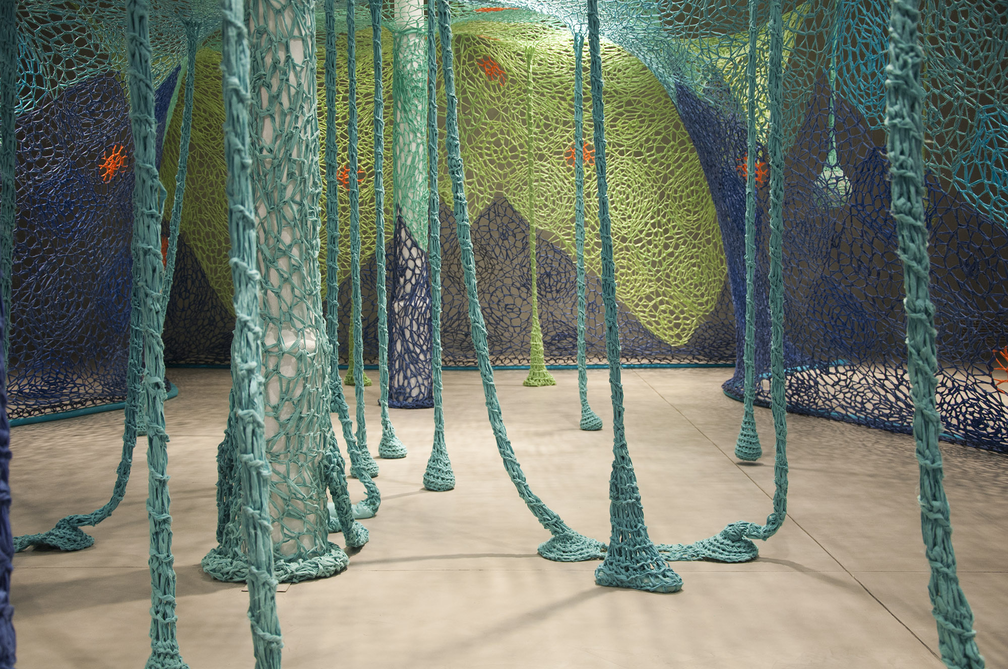 Fabric threads form waves of turquoise, periwinkle and lime accented by bright flashes of neon orange, spiral into an intricate web. Buoys suspended float around the encompassing underbelly of the net. Moments of nebulous forms connect through the exhibition space, revealing rocks which protrude from the woven structures. Brazilian artist Ernesto Neto presents his large-scale immersive installation, Um dia todos fomos peixes as part of a larger exhibition One Day We Were All Fish and the Earth’s Belly housed at the Johannesburg Goodman Gallery (24 November – 19 January 2019). As his debut on the continent, the sculptural work is representative of an enormous fish – signifying the gravity of ecological ailments affecting the ocean and a symbolic desire for spiritual transformation by illuminating our interconnectedness with nature.