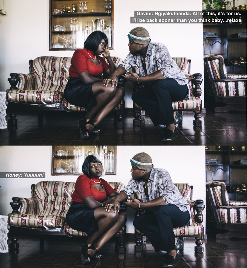Scroll further down and we are introduced to Gavini. With a backdrop of a bare field surrounded by tiny tin homes and bright yellow lights, these two go spinning through the dust in a red “Gusheshe” BMW. This couple are making plans. In their ride we find them waiting, she too has to be ready with a loaded gun in her hand. This woman does not like to be made waiting and Gavini knows this very well. We are warned who Honey is through Gavini’s eyes that glare at the viewer over dark shades, “Honey ain’t a play thing. Respect The Honey”.