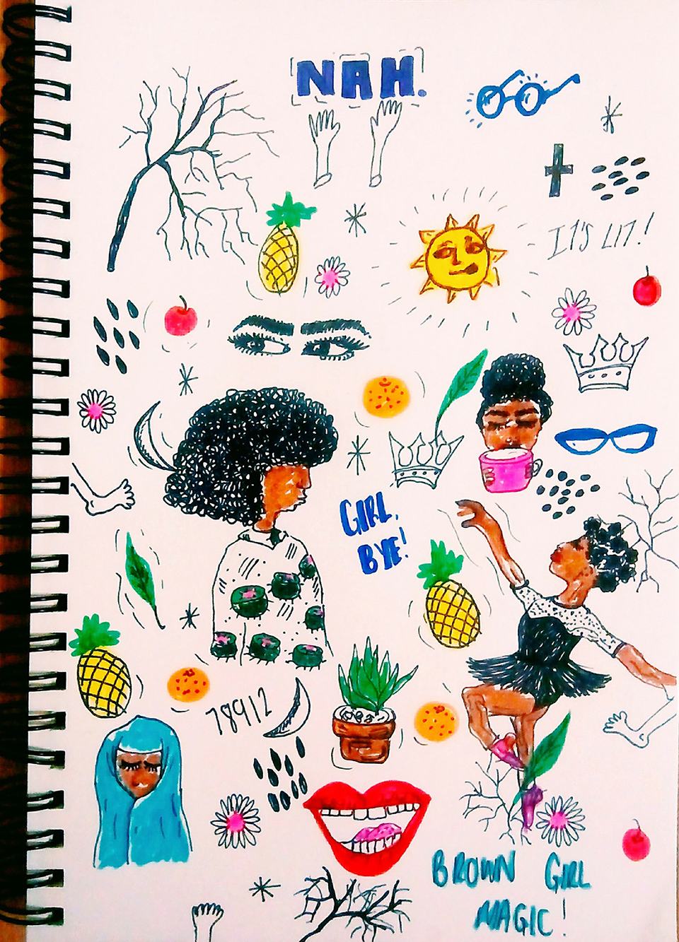 Nokwanda describes her illustrations as a reflection of her personality. “My work is whimsical, quirky. It’s got a lotta life!” she exclaimed. The similarities between her and her work became quite clear when her giggles and cute comments during our conversation reminded me of the squiggles and playful style of her illustrations. These fun doodles often surround the protagonists of her work; women of colour who wear their hair as crowns.