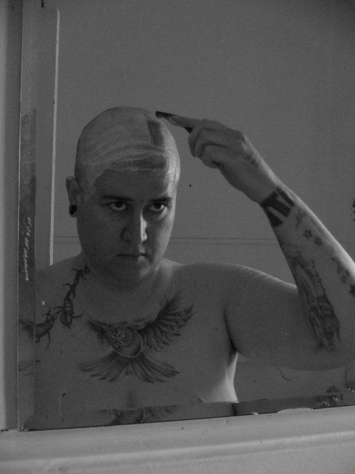 Through self-portraiture he would perform gender by using props and make-up. He would examine his responses to gender and his own preconceptions of it. “By doing such analysis you can only find out what you are by what you are not. If I am not this blank canvas then what am I?” For him the art process is one of self-exploration. For him the testosterone and tattoos would also be a crucial part of his method of “painting”. His process becomes one of self-examination, of who you are and who you can be. The body becomes the canvas in which one can “play out the roles”.