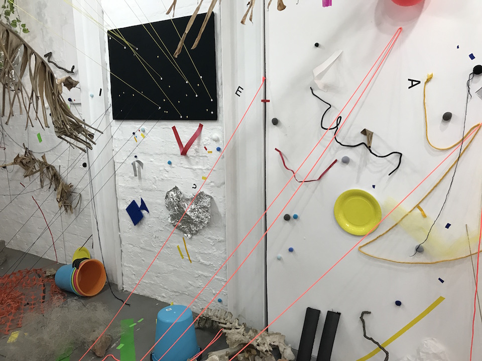 But it didn’t simply end there. If it had I might be writing how the installation was a reflection of the overwhelming urbanisation and the effect this has on nature. However, the third element (if I can so crudely group them like this) that I picked out was that of pure line and colour. Coloured string hung from the walls and the ceiling, draping down onto the floor. Neon duct tape covered the surface of the gallery, supporting objects on the wall or cutting through the harsh geometric surrounds. And little fluffy balls were pinned everywhere, little splashes of colour that then expanded when a balloon or party plate came into view. Makandal’s work makes me imagine what might have happened had Joan Miro worked in Johannesburg as an artist. There is the grunge and grit of this urban stew mixed in with transcendental moments of colour and form that seem to have jumped in from another dimension.