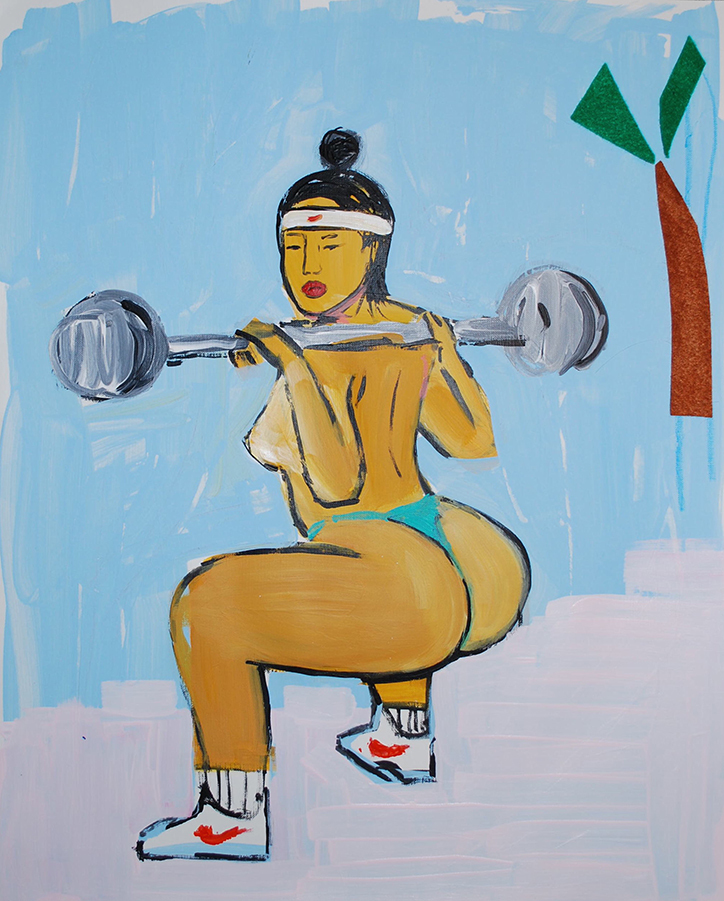 Monica Kim Garza. The Mexican-Korean artist’s paintings and mixed media work depict women with fuller figures partaking in activities such as sun tanning, riding bicycles and lifting barbells bare-breasted. Often the women in her images appear to be going about these activities with little care for the viewer’s attention, and other times their eyes confront the viewer directly. Painted in all shades of brown, Garza’s subtle shading and bold black outlines make the female figures in her works the focus of each image despite their little care for the viewer’s attention.