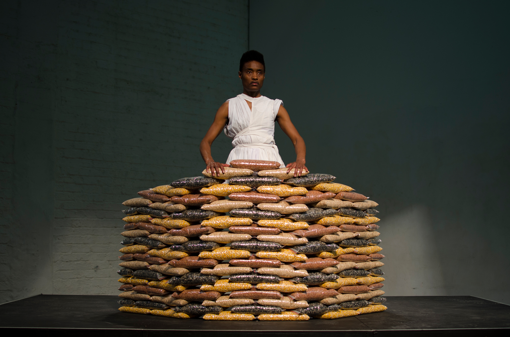 “‘Wo’ ‘Bang bang wo’. It means ‘help’ in Mandarin,” I explained as we searched desperately for parking in the streets of Maboneng. Statuesque and in all white, the sight of Nelisiwe Xaba at the door steadied our hurried pace before entering The Centre for the Less Good Idea. The room hushed when Xaba stepped onto the podium she shared with stacks of clear rectangular plastic bags containing various seeds and grains. With a playful candour, Xaba began constructing a coordinated vertical structure. The making of Xaba’s lecture performance was calculated and neatly built on local and global understandings of help and her interrogatory monologue was jam-packed with more than just seeds and grains.