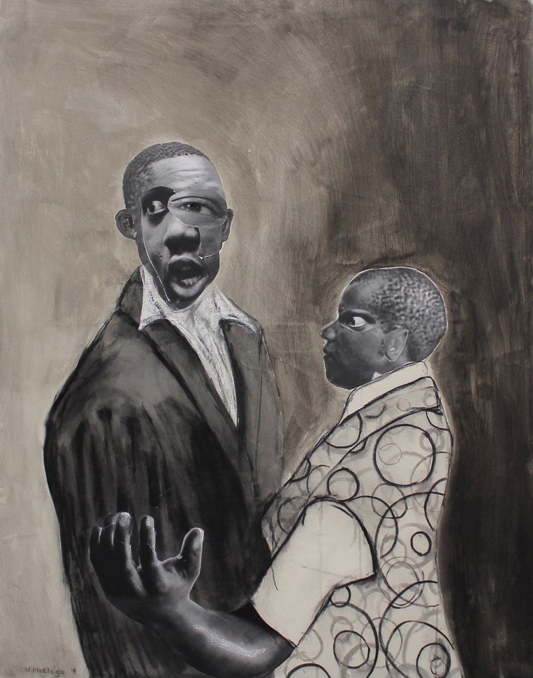 Matloga’s work concerns itself with the domestic—using primarily a black, grey and white palette with charcoal, ink wash and collage, he depicts the everyday lives of black South African families. Matloga’s creations are flat but not unexciting; faces are often assembled from photographic cut-outs to create distorted, strong and compelling features. An oversized nose, lips too large, eyes and ears twisted out of shape—this contortion, warping and bending exposes the politics of beauty; what is beauty, if not a judgement based on discredited, fusty hierarchies tainted with sexism, racism, colonialism and class privilege (G Perry).