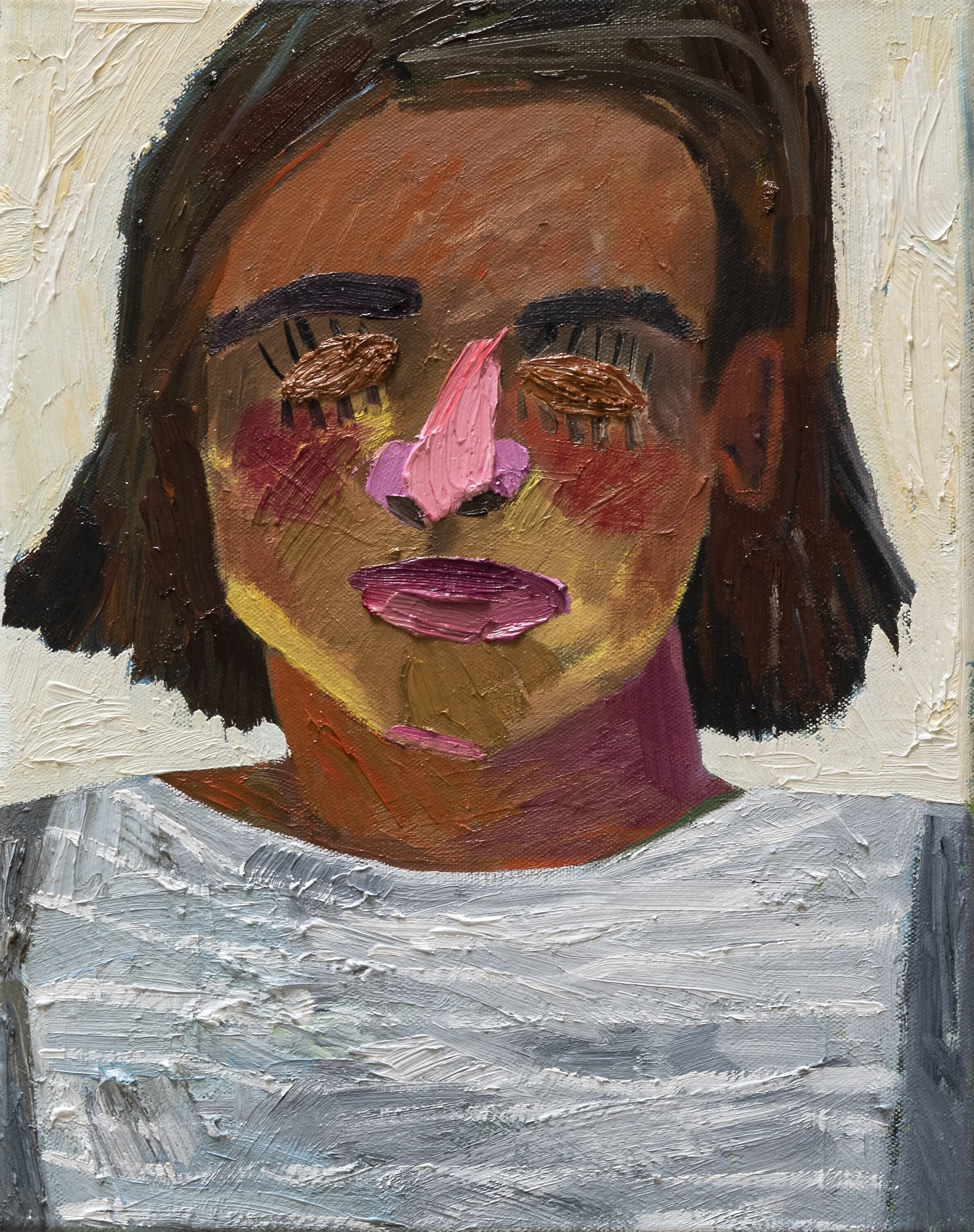 I’ve made a painting, my first real delving into portraiture since I returned to practicing in the past two years. For two years after graduating from Michaelis I didn’t step into a gallery or make a work. It’s a playful self-portrait. I like to use humour to address serious topics. It’s called Almond Eyes and, literally, I have almonds placed over my eyes. It’s a commentary on the fetishisation of woman of colour and the use of food produce to describe aspects of our anatomy. For example, having cocoa skin, or mocha skin. I listened to a podcast recently in which they did the same for white skin, describing it “mayo” like, which by reflection shows the absurdity of these adjectives. Portraiture is a very new thing for me but I’m loving it. I used to do a lot of still lifes but always saw them as self- portraits too, but now I feel I’m being a bit more honest and direct by painting myself.
