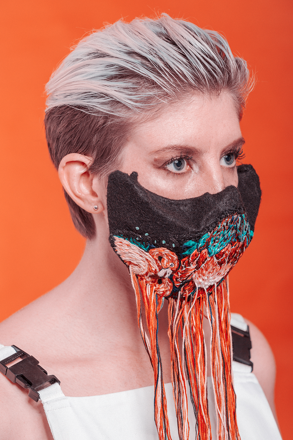 Hannah’s hand-sewn pieces provide a reflection on the ways in which femme bodies have been stereotyped, the importance of embracing multiple genders and sexual orientations as well as affirmative self-talk when it comes to femme beings. These are communicated with emojis and other symbols associated with internet aesthetics.