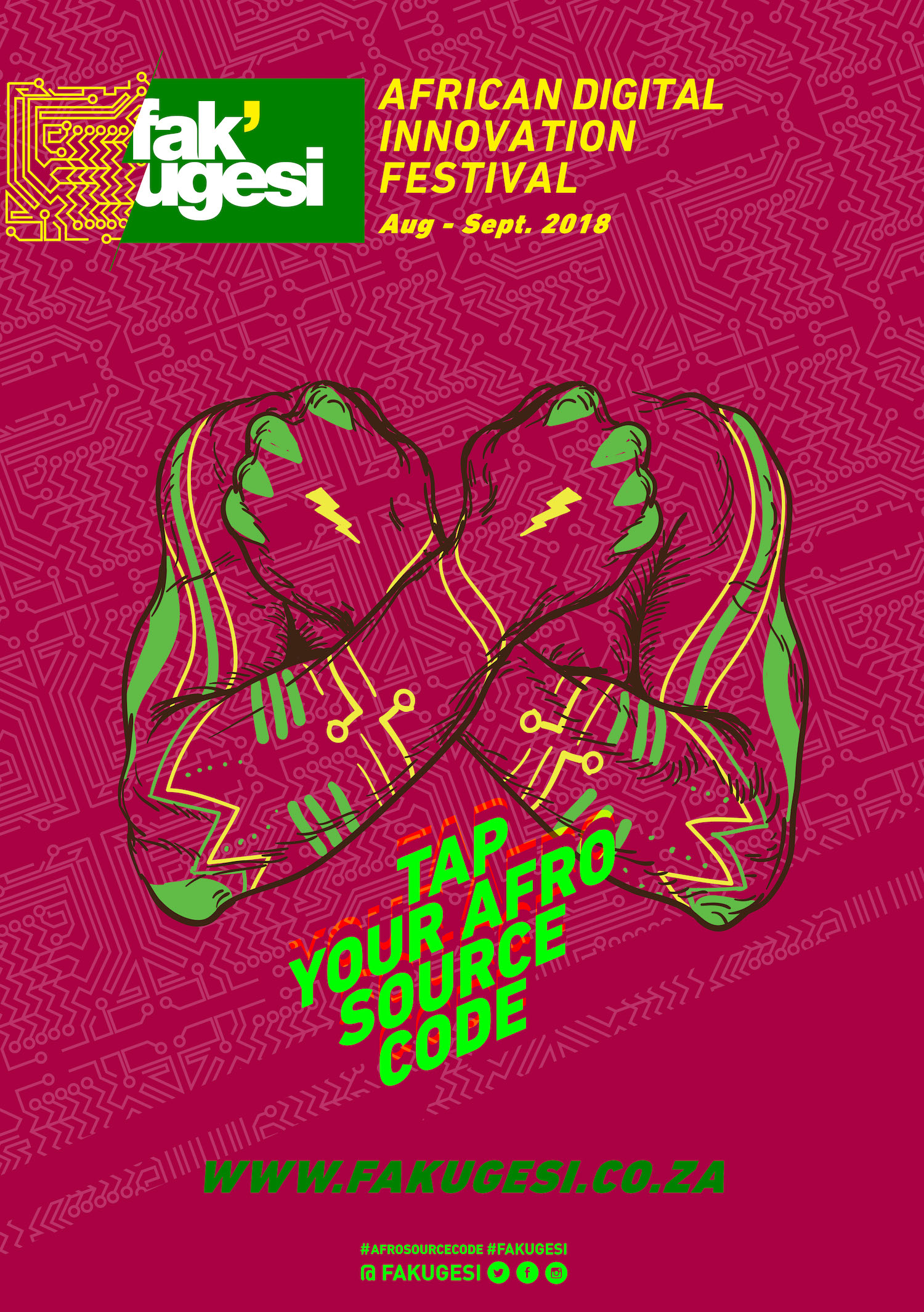 The Fak’ugesi African Digital Innovation Festival is generated around collaboration, conversation and projects – for Africans by Africans. An “African celebration of digital technology, art and culture”. Taking place in Johannesburg, the festival is gaged towards encouraging not only people in the city but inhabitants of the continent, to embrace their innovative thoughts and creativity and to gear them towards the digital, African visualizations of their city and future imaginaries. This year’s theme, ‘Afro Source Code’ was introduced by the open call for entries to illustrate the 2018 poster, prompting creatives to “tap [their] Afro Source Code” for inventive Afro futurist, tech and African aesthetics inspired illustration concepts. “Ungaphthelwa Innovation Yako” / “Own Your Innovation”.