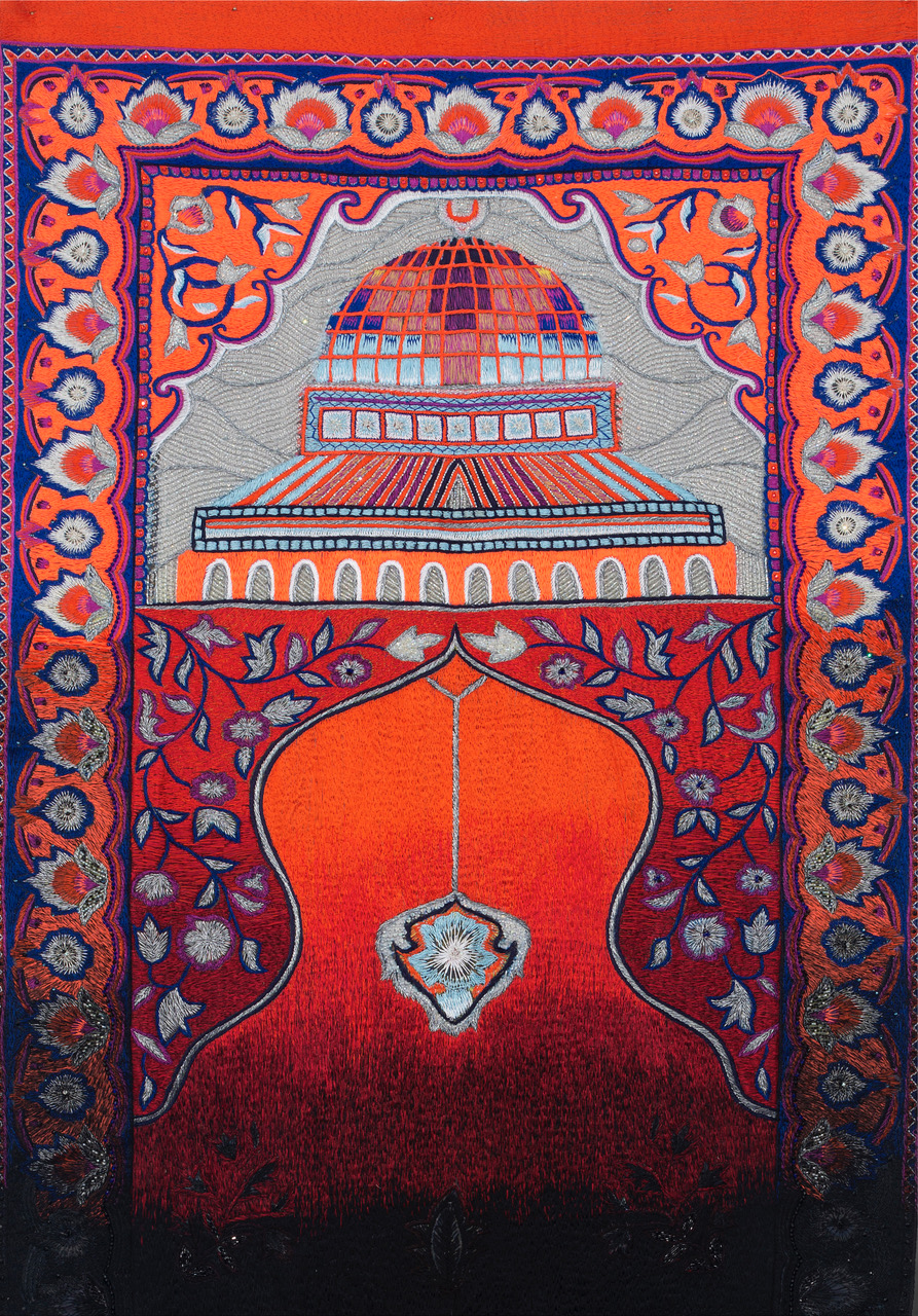 Intricate threads weave their way in waves of colour. Golden vines ascend into blossoming buds. Backlit by clear sky hues. Scarlet ribbons mark an avian paradise bellow a crimson crest suspended from the heavens. Ritualised in stitches and the repetition of prayer.