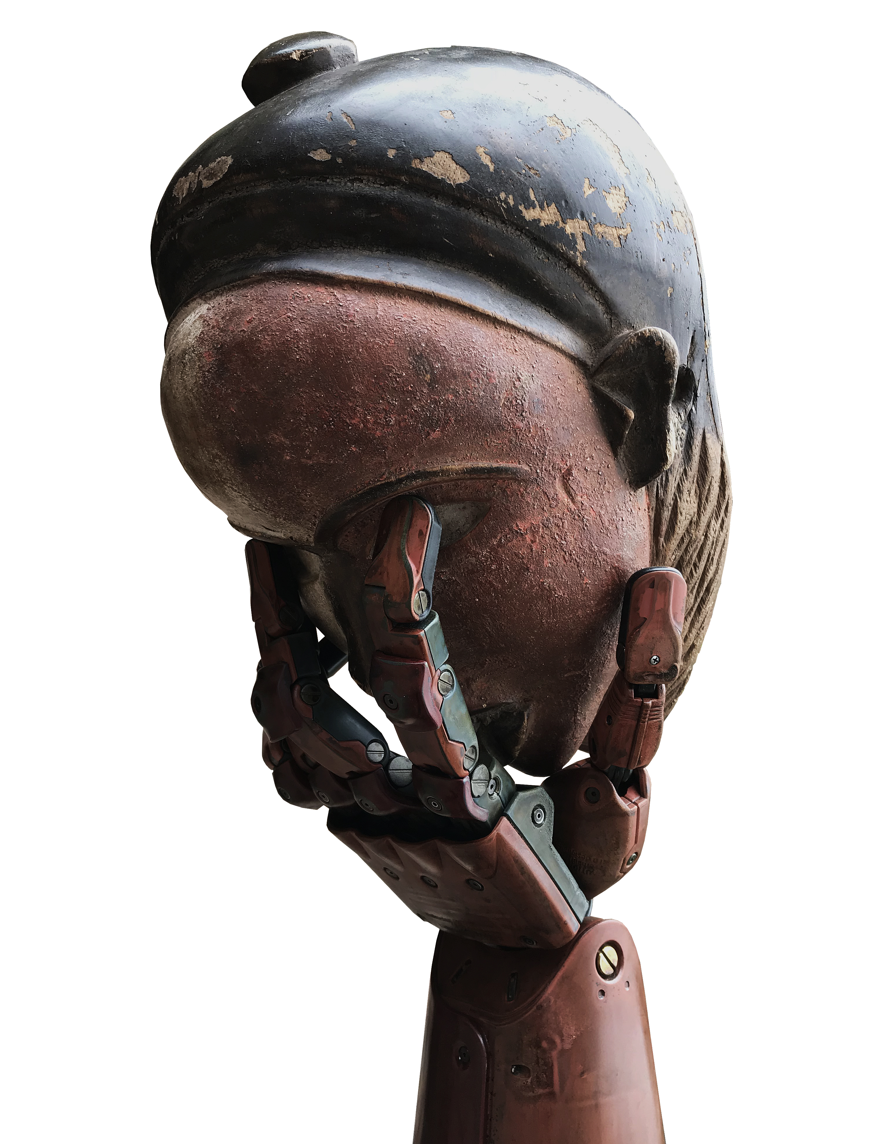PLAY, DIE, RESTART debases the cinematic legacies of Heart of Darkness (Conrad, 1902). A refilming of Kong: Skull Island (2017) the visual component is disrupted by making use of a fractal lens with the original audio screen; and is influenced by the use of Francis Ford Coppola’s Apocalypse Now’s second-hand narrative vanity of an up-river journey into the Heart of Darkness. PLAY, DIE, RESTART unfolds dated approaches of colonial era depiction. Representations of Africa in film, both the real and imagined are explored in various works including Blomkamp’s District 9 (2009) in Private Grammar II (2011), through the Warner Bros. branded 35mm film reels of Porte-parole (2018) and in Posuban (2016).