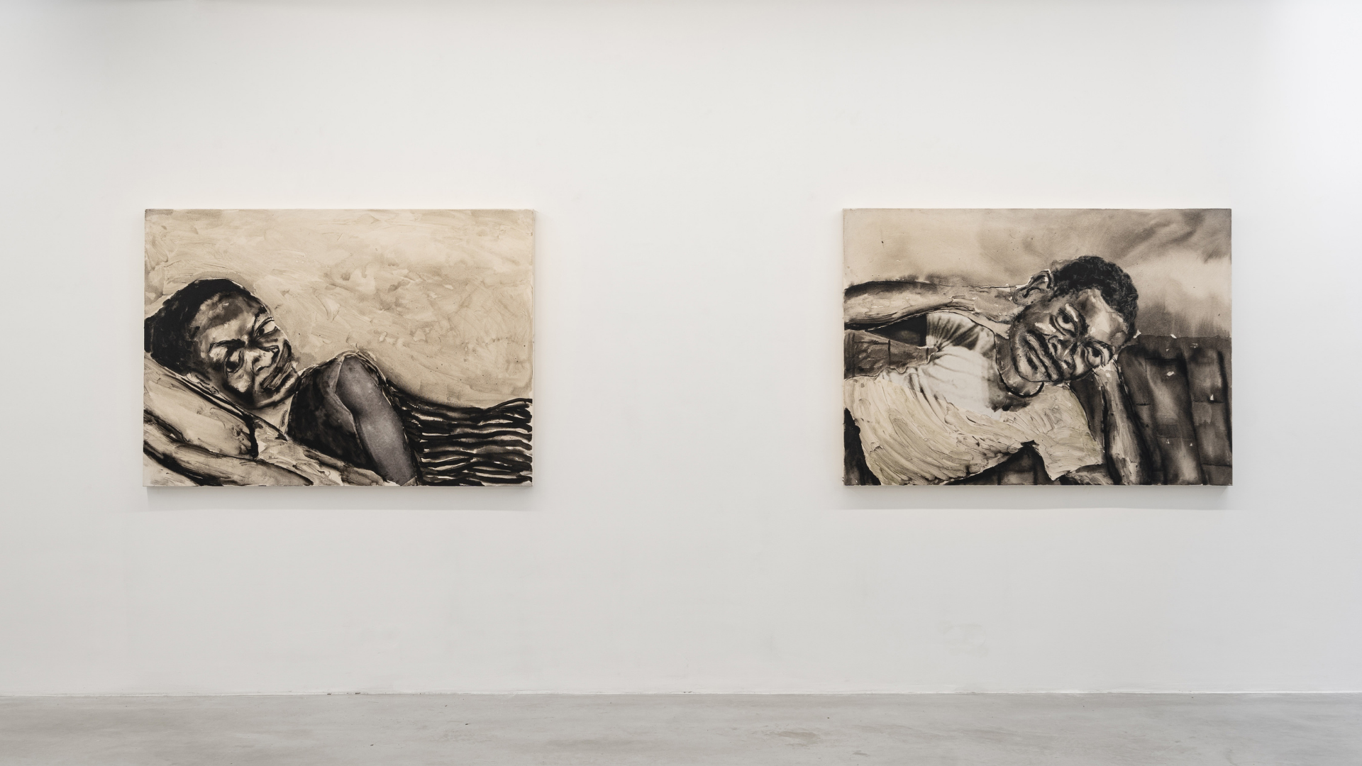 Nwagbogu’s reading is eclipsed by Figures. Not only do Matloga’s figures seem inhibited by the conservative surfaces on which they are presented, but they clearly do not own this space. They seem to be limited by their form. With a focus on charcoal and ink, Matloga’s departure from design-like collage into painting is characterised by a strong sense of restraint. The works appear to adopt a Dumasian proclivity for black-and-white palettes, with very minimal collage aspects. While impressively autographic, they are notably sparse, comprised of quite quiet strokes and layers of pigment.