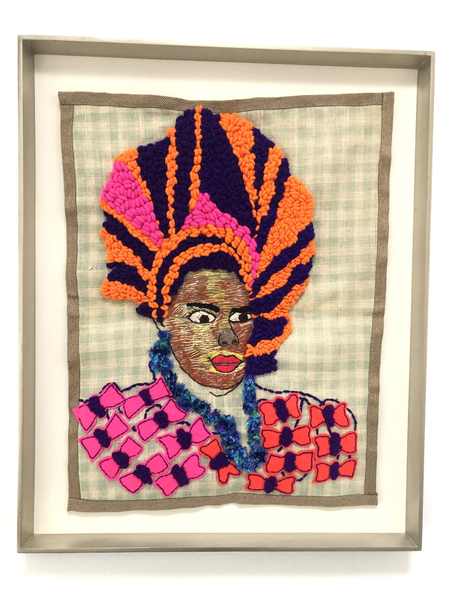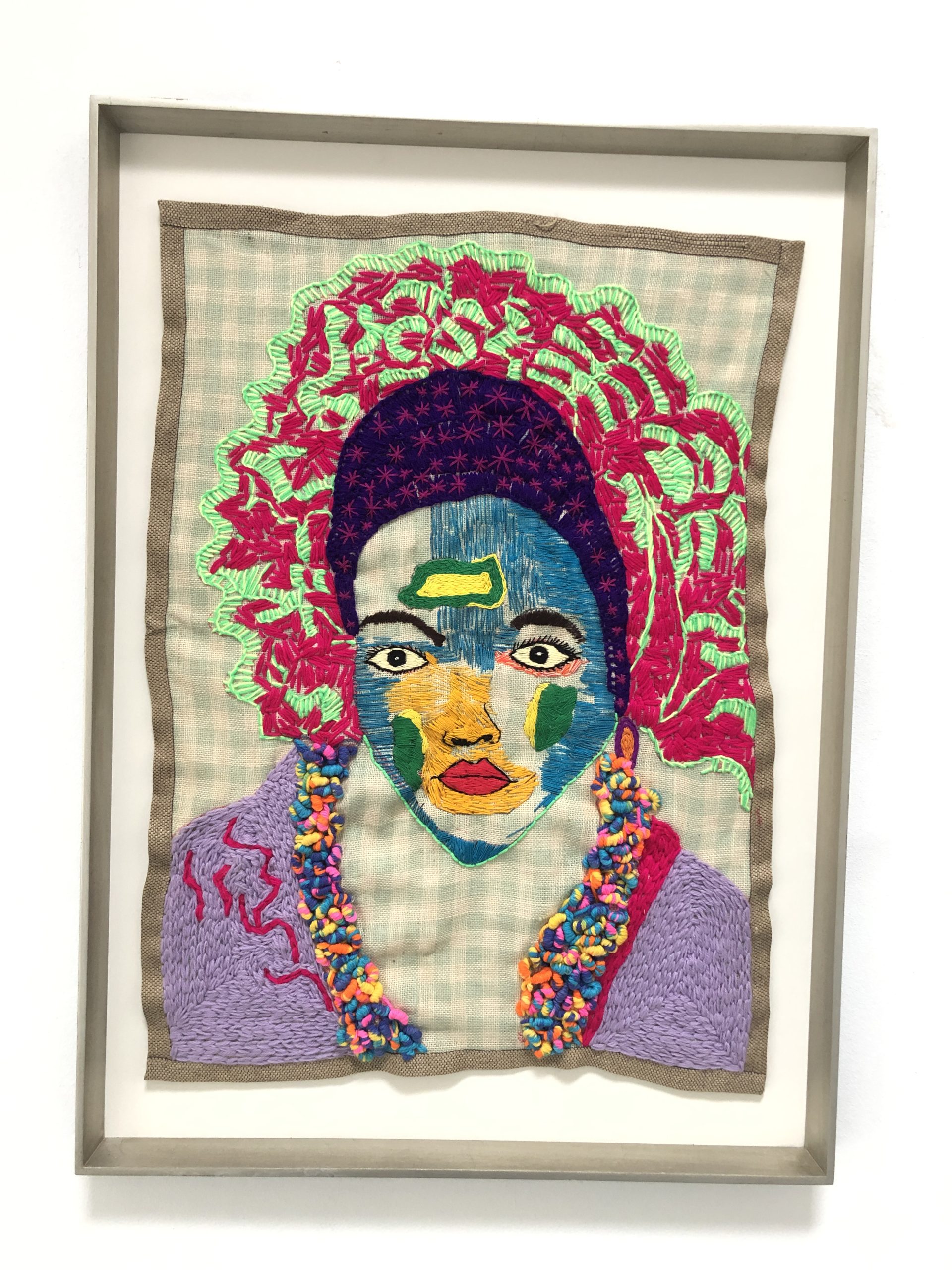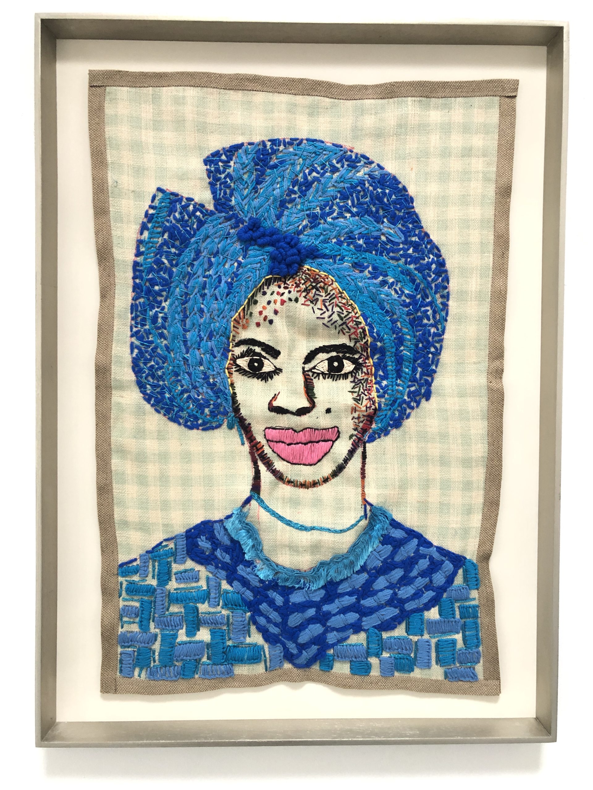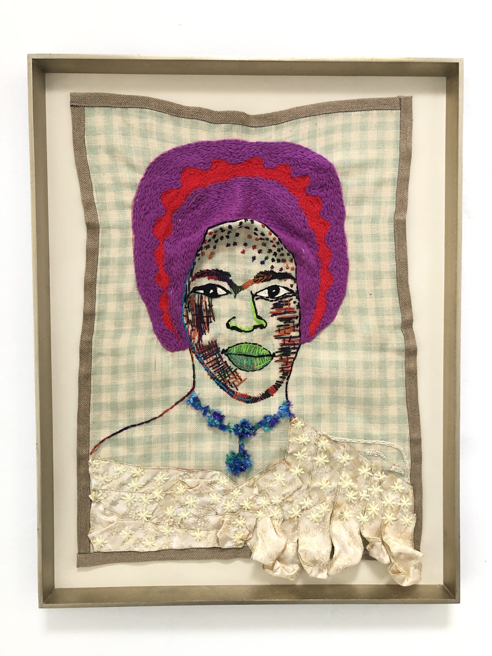 Lerato Motau: I remember I enjoyed needlework as a medium in primary school because I had dyslexia, and I did not know what was going on with me. I could not read and write. I was the happiest child in class regarding needlework, creating work that I loved. This is one medium I can say sustained me throughout my life. Even when I studied Fine Arts, at the back of my mind I knew that I still must use embroidery as a medium and in 2005, I enrolled on a course in which I studied basic embroidery. That was the time the childhood thoughts and memories at the back of my mind came back and fulfilled my space. I am left-handed and it is difficult to teach a person who is left-handed to embroider, knit or crochet. Yet, I remember our teacher would always ask me to demonstrate to the class. I felt proud that there was something that I knew how to do. I also wanted to find a communication tool that does not have text but is visual. That is why if you look at the faces, some of them are so detailed that they are more of bespoke pieces that one enjoys looking at. I wanted that to also come across. Because of my dyslexia, sometimes I do not like writing much when I share art on social media but the art has to speak for itself.