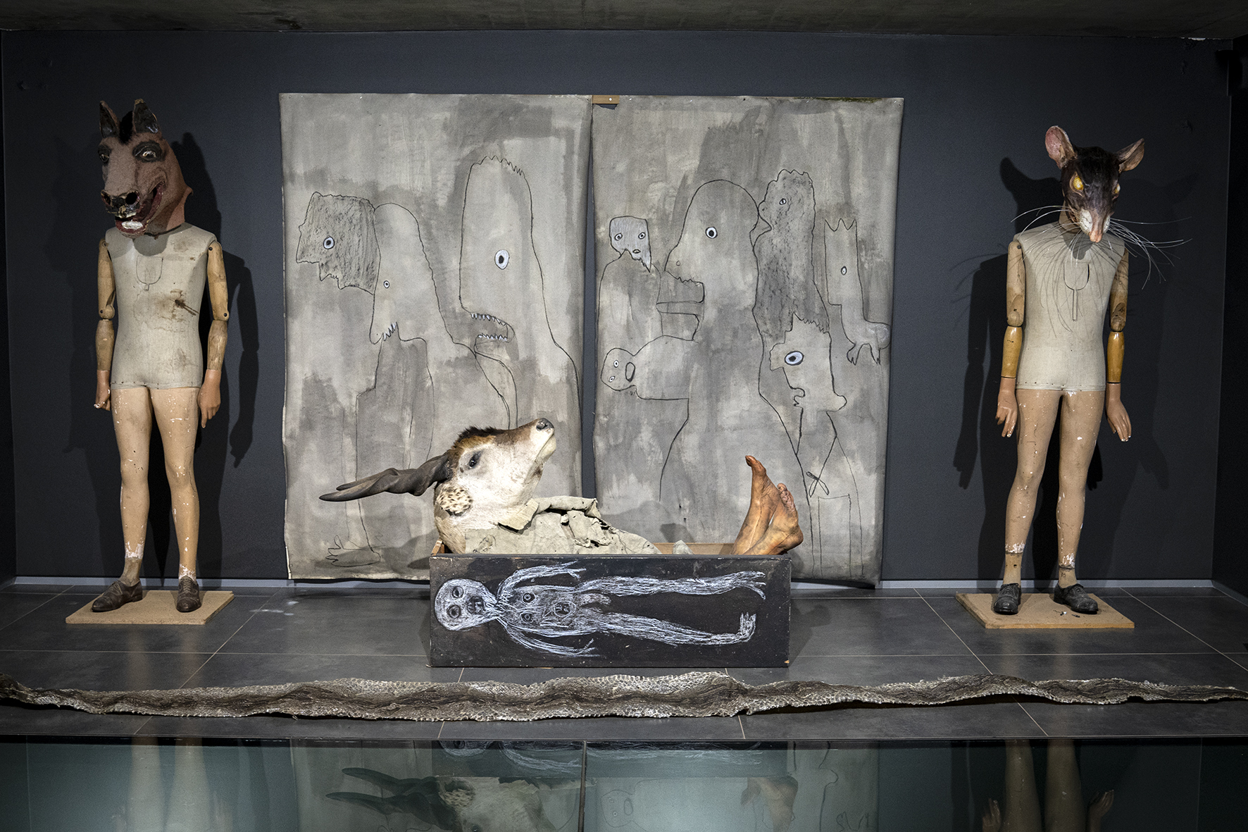 Apart from the formal presentation upstairs, which takes an ethnographic tone, the rest of Ballen’s inaugural exhibition End of the Game exudes comfortable chaos. Curated by Ballen, it explores the historical and ecological impacts of African hunting expeditions during colonialism. Featuring photographs, sculptures, installations, and Ballen’s distinctive creatures like taxidermy animals and mangled mannequins, the exhibition evokes a strong sense of the grotesque. A theme that permeates the exhibition texts and signage.