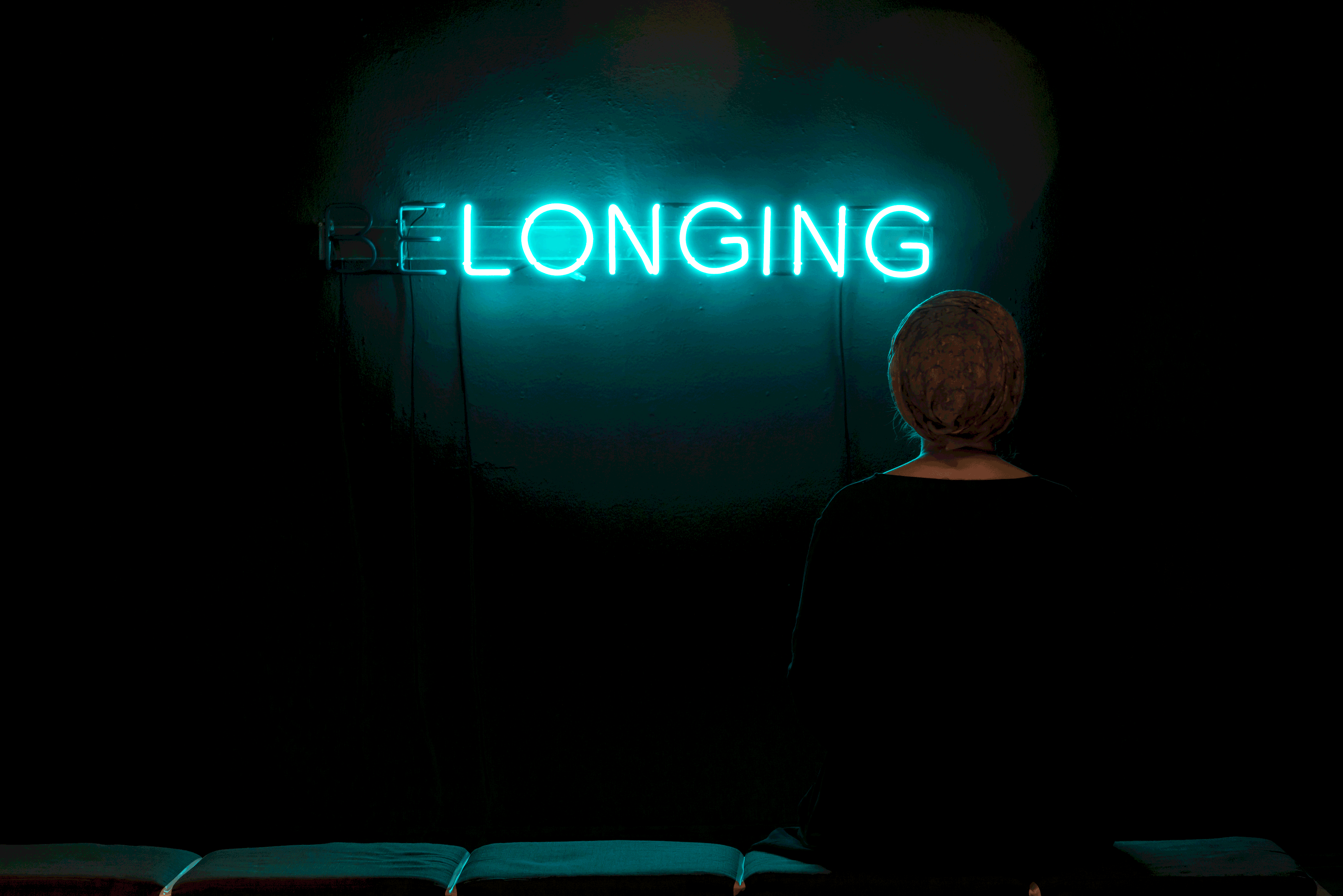 It is important that this exhibition is participatory, in the sense that the works can only be experienced through an active engagement with them: paging through the interviews in the book; waiting your turn to enter the video room; sitting intimately next to another person and watching the stories; sitting on the bench alone or together to trigger the ‘BE’ in ‘BELONGING’ neon.