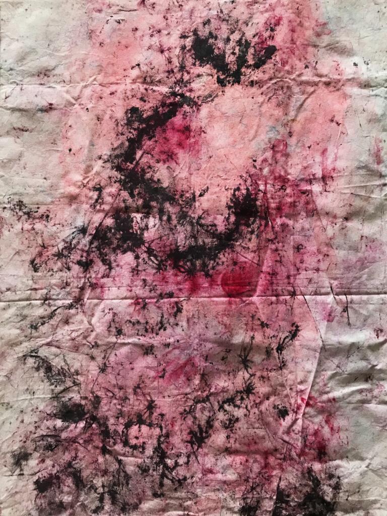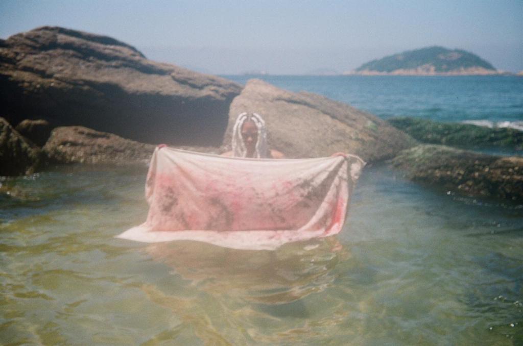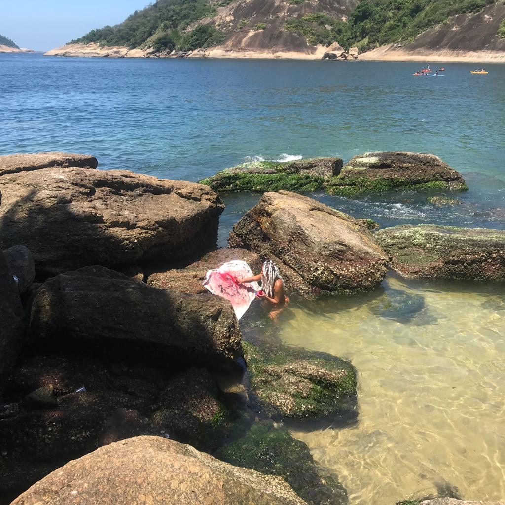 Então, totalmente maluquice, não tem nem lógica. Quando eu fiz, no ano passado, liguei para uma amiga que mora no Rio de Janeiro e falei: ”eu preciso pintar no mar, você deixa eu ficar na sua casa?”. Cheguei no Rio de Janeiro na sexta e no sábado já estava pintando no mar e ela já estava me registrando. Foi tudo muito rápido, eu só tive a vontade e fiz. Foi muito louco ter essa possibilidade. Eu fiquei chocada. Depois que eu parei para pensar em algumas coisas que eu já tinha feito e tem muito disso no trabalho. O resgate, a saudade, se revisitar. Eu fiquei pensando nisso e em como foi totalmente impulsivo e só regido por vontade. Só isso. Eu via a potência do trabalho, óbvio, porque trata de questões que são não só a pintura e sim a água dali pintando ele mesmo e a impressão da pedra sobre ela mesma. Isso deixou um registro na tela e o vídeo me registrou fazendo parte daquilo. Como seria incrível só fazer parte de alguma coisa tão grande como o mar. As belas artes colocam a gente para um lugar muito mais tecnológico agora, sendo que não tem como. Porque para mim, para o meu processo, a natureza está muito presente. E a natureza precisa ser revisitada por mim. É muito essa a questão do mar. Ele existe, ele está ali e é tão grande. Tanta coisa acontece ali, tanta coisa já aconteceu. E mesmo assim, ele continua. É uma das poucas coisas que a gente não consegue domar. É muito da falta de adestramento humano. A gente consegue se adestrar, a gente consegue adestrar o outro, causar grandes impactos, mas com a água não acontece isso. A água não vai e não vem dessa vontade.