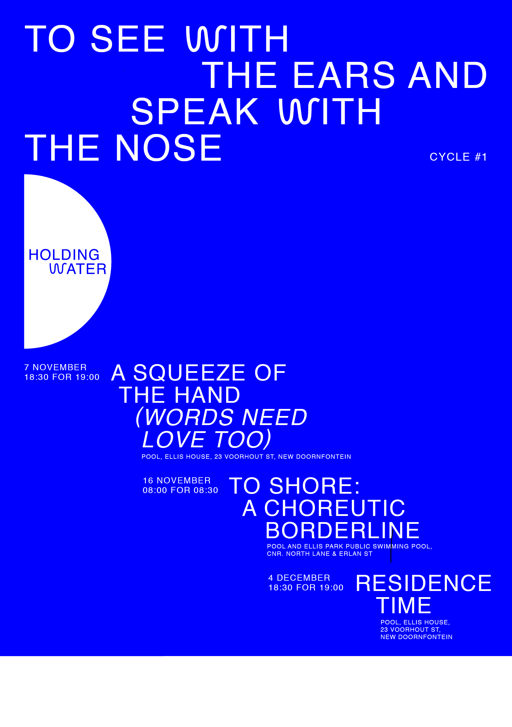 Residence Time, the next gathering of ‘To See With The Ears and Speak With The Nose’, will occur on 4 December 18:30 for 19:00. Meet at POOL, Ellis House, 23 Voorhout St, New Doornfontein