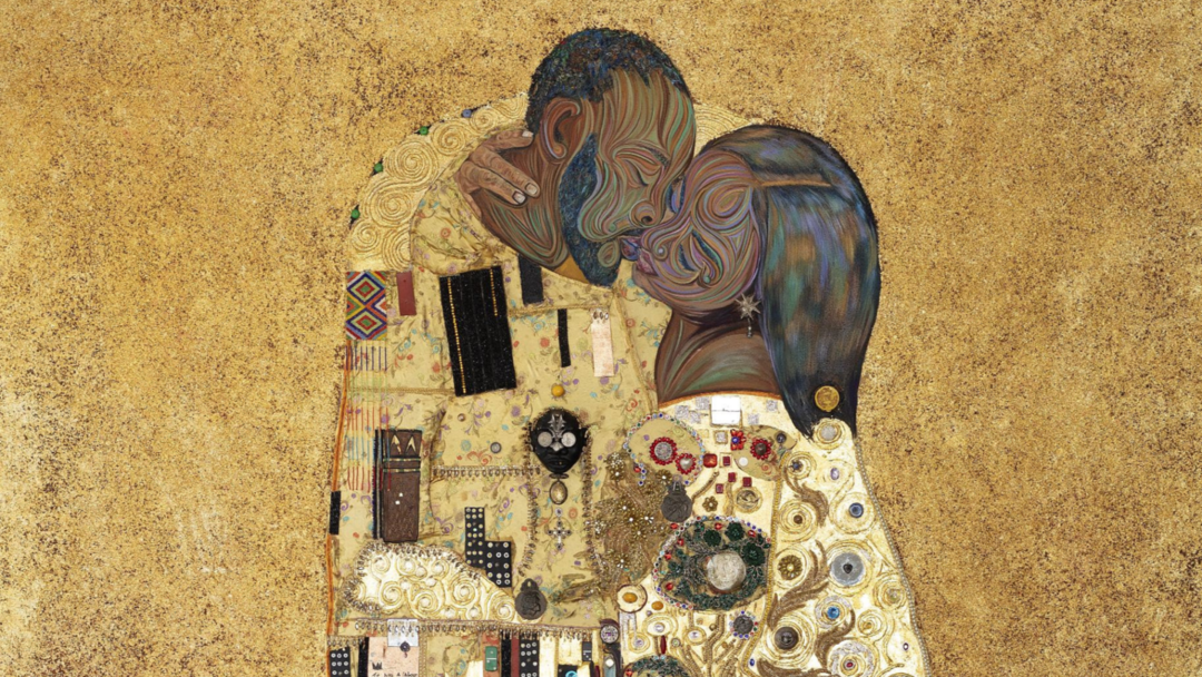 Imagine my intrigue then when I recently saw Mabulu’s perfectly pretty painting, The Kiss (2022-2023) as the entrance piece at Everard Read. The Kiss combines oil, acrylic paint, gold leaf, textiles and various found materials, producing a sumptuously tactile quality. Its colossal scale and luxurious aesthetic make its intentions clear. With a whopping price tag of R869,565–R1,000,000, this work is undoubtedly aimed solely at Everard Read’s affluent (and mostly white) clientele. Beyond a few stylistic changes, skin tone and shoe choice, it is a faithful recreation of one of the most expensive artworks in the world.
