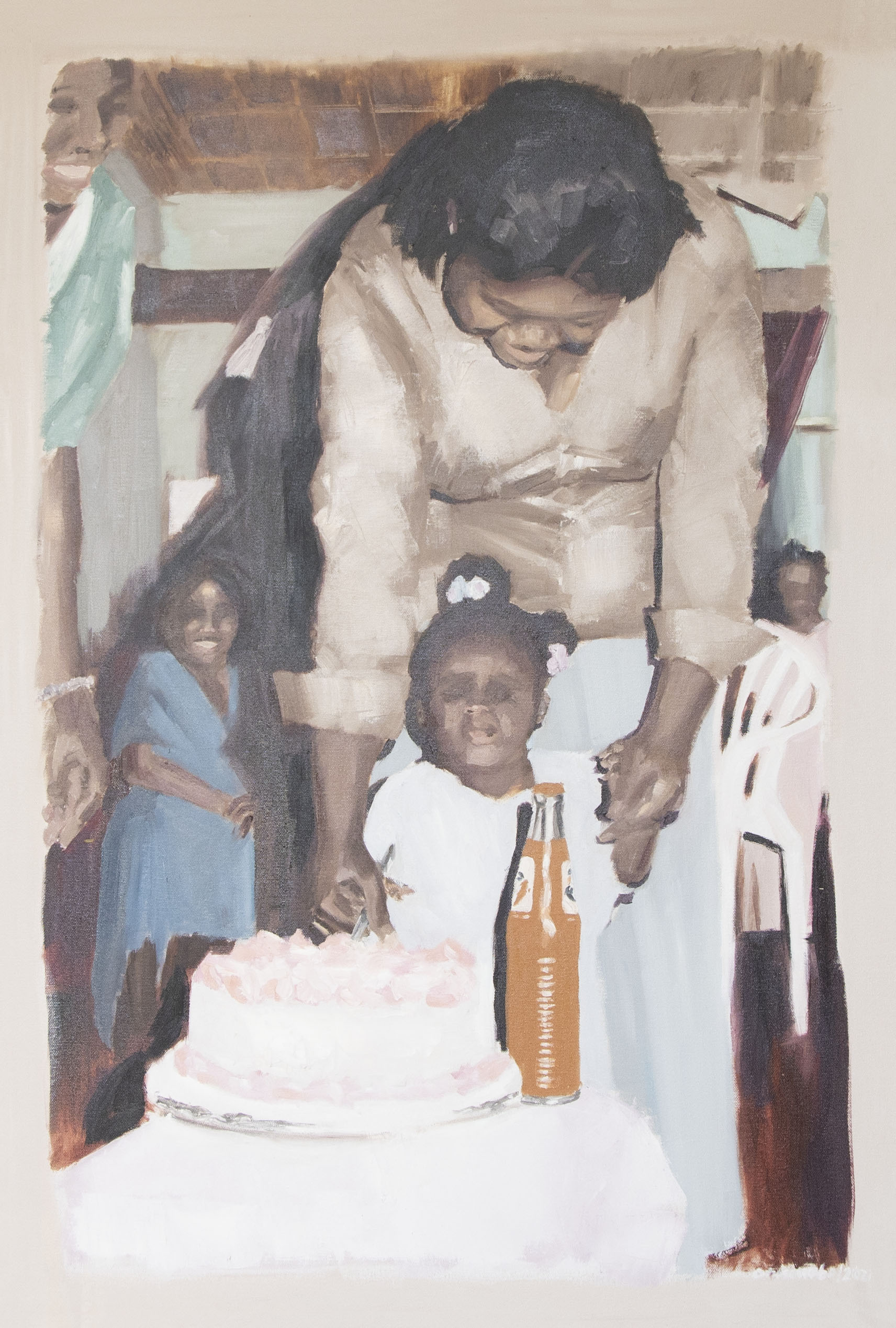 In Marcus’ work, the opposite is true. Representation exists and yet it is rendered opaque — a slight tilt of the head downwards as a woman assists a child cutting a cake, another child with a blue dress is visible in the background.