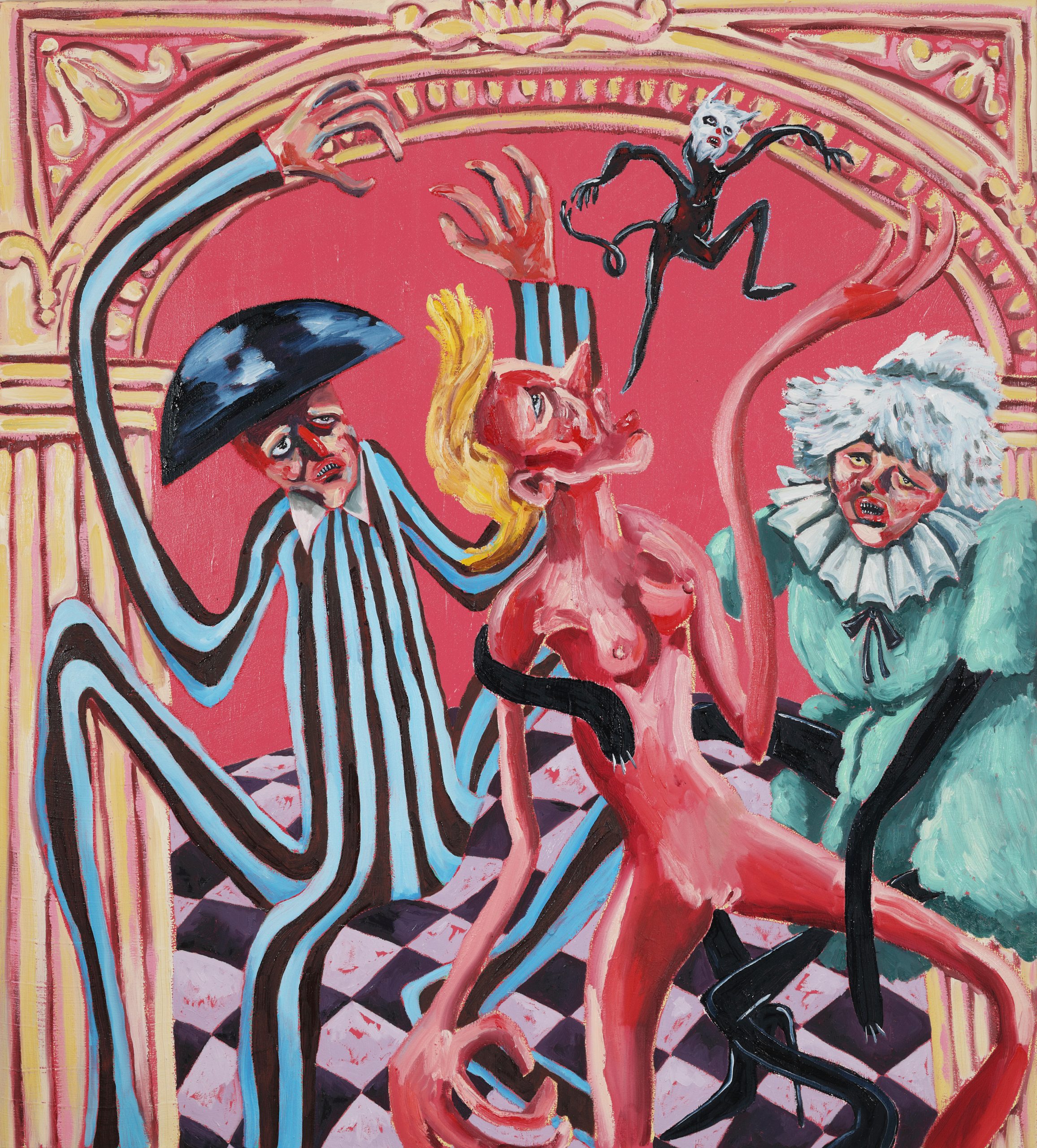 Dominique Cheminais is a dexterous colourist — she mixes, shades and tinges with intonations and delicate variations that produce remarkable visual sensations. Her solo exhibition at THK Gallery in Cape Town, Things Done While Dreaming, reads like a rediscovery of the plasticity of representation where characters from her literary texts are vigorously animated in a world of daydreams and nightmares. The painting show is filled with long-limbed figures lumbering around in dark and strange settings — wrestling wild animals, shadows and themselves and sometimes engaging in cultic rituals including a bizarre tea party served on a pink torso with adorable, and probably delicious, cookies spread on the floor. In a press release statement, Cheminais shares: