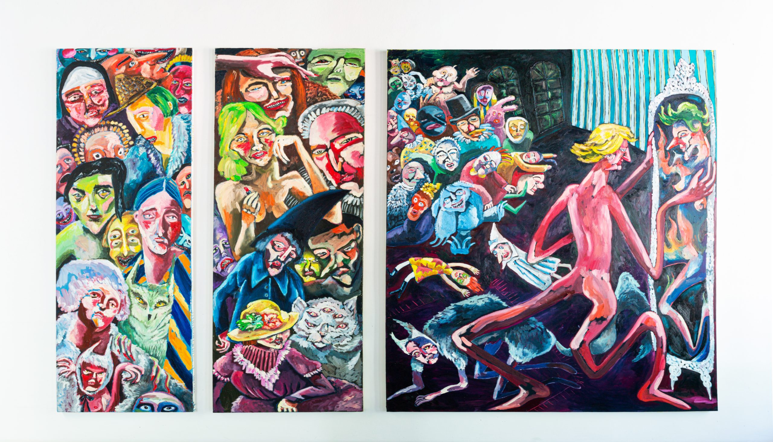 Weird, violent, gory, energetic, satirical, heavy, funny and fresh are a few (confusing but not untrue) words I have heard used to describe the work. Even when you are drawn to the paintings and actually like them, they leave you feeling uneasy. Formally, I read Cheminais’ works within the stylistic mode of artists such as Christina Quarles and John Currin. Although their figures are often recognisable as ‘people’, they are always an inch removed from any notion of realistic depiction — always hovering above the world of absurdism, reflected in writer Liz Gorny‘s contemplation (through the work of Miranda July) of artistic practice “invested in humanity at its strangest and most instinctual; violence, desire, loneliness, motherhood, connection.” I might add; bleak, comedic and nonsensical — they are creepy and alluring. And they never fail to seduce, assault, delight and confuse.