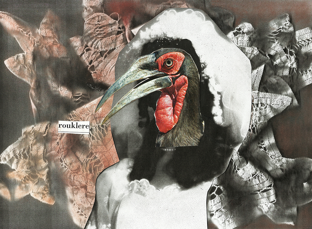 The question then became, how would I access this woman? And the simplest answer that came to me was through her photographs and her personal belongings that spoke to who she is. I walked to my mother’s ill maintained filing cabinet and pulled out the red leather bound family album and pulled images from the archive that spoke to me. The next answer came for me through the embroidered lappies that each woman in my family owned (to be placed on a tea tray). After letting the fabric rest in my hands and really feeling it my next instinct was to photocopy its creases and textures. Then I photocopied a photograph of my mother on her wedding day. Onto the photocopied image of the lappie, I painted with eyeshadow pallets and smeared over that with glue to create a varnish. Before I knew it, I was collaging, and my mother’s face become that of a vulture. By her head are the words “ROU KLERE”, which directly translates to “clothes of mourning”. Her wedding day, was a day of sadness and the beginning of a lifetime of sadness. Each collage I’ve created are family portraits with their own narratives to bare.