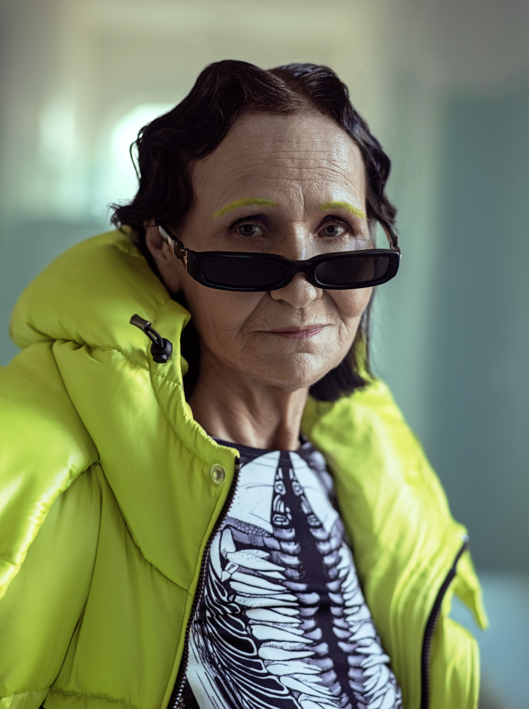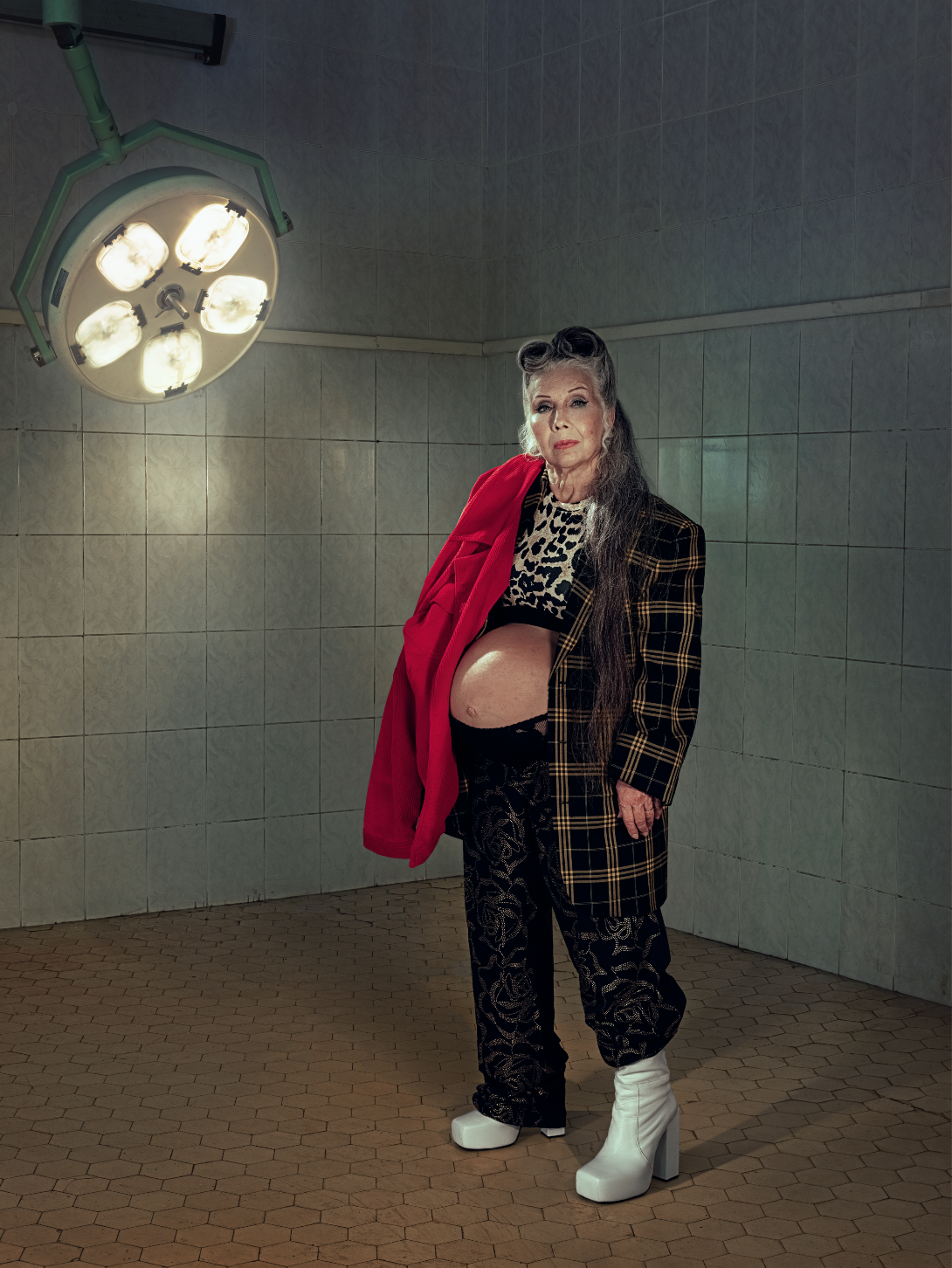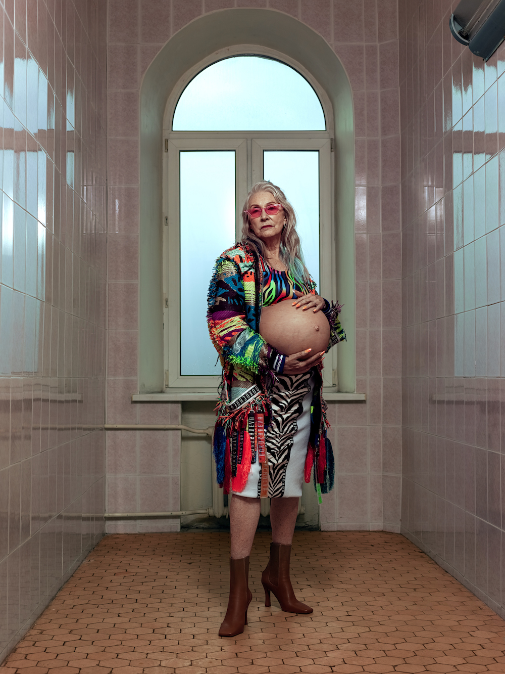 Shot in Russia in what used to be one of the leading gynaecological hospitals in the country, the 1911 Hospital has been unused since 2013. The location also plays with our perception, combining the new with the old. The videos’ set design look and aesthetic feel channels a strong post-soviet aesthetic — we find pop band posters hanging on the wall along with Russian propaganda prints praising the traditional family. The result is an apparent eclectic ensemble aimed at challenging what we know and take for granted, while leaving us wondering about what would happen if we stopped adhering to social norms and acting according to society’s expectations. As in Radchenko’s previous productions there is a strong fashion element in GRANDmothers, the styling, clothing and aesthetic choices made in producing the short film all come together to become the very material mediations by juxtaposition of this “visually speaking back to” oppressive and toxic ideologies on age and motherhood. Drawing inspiration from her own mother, Anna began exploring the topic with her 2017 fashion film Silver Goddesses in which she celebrated the beauty and spirit of getting older. GRANDmothers represents a continuation of this discourse by presenting creative, active, pregnant women who simply happen to be older — challenging our own internalised bias by having us reassess our expectations of what is beautiful, youthful and empowering.