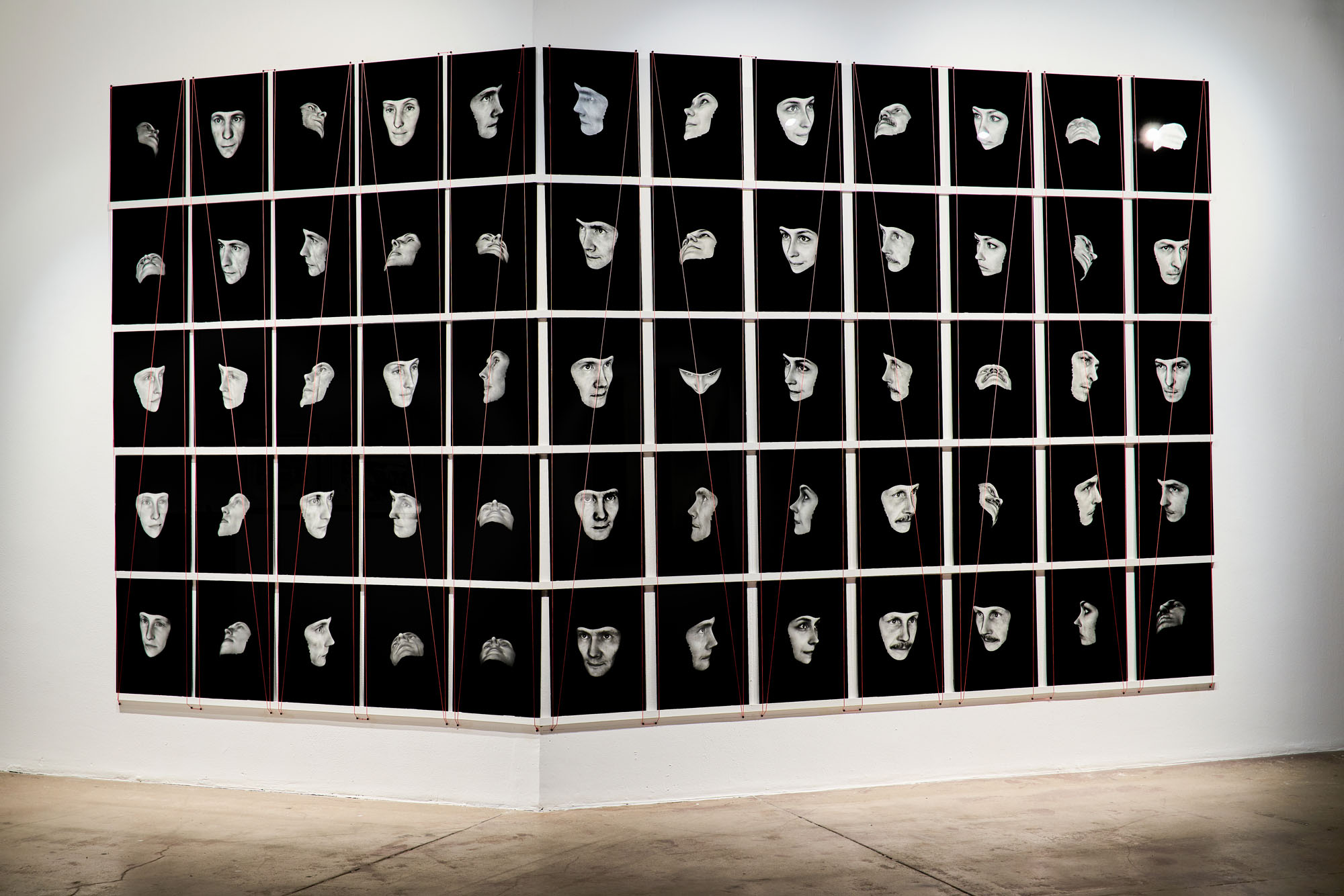 Goldblatt’s ‘While In Traffic, Johannesburg’ is exhibited opposite Broomberg and Chanarin’s ‘Spirit is a Bone’, an installation of disembodied facial renderings of Moscow citizens realised by technology employed in public security and border control surveillance. The portraits are best best described as digital life masks and are taken by a machine, and subsequently stitched together to create a likeness of a subject. As Broomberg and Chanarin succinctly state: “the success of these images is determined by how precisely this machine can identify its subject: the characteristics of the nose, the eyes, the chin, and how these intersect. Nevertheless they cannot help being portraits of individuals, struggling and often failing to negotiate a civil contract with state power.” Broomberg and Chanarin have printed these images onto a luminous reflective photographic substrate and embedded onto apertures of clear glass on the reverse of highly reflective black glass. The result is one in which audiences see their own faces reflected and cant help but negotiate their own features while negotiating the images. By contrast, mounir fatmi’s ‘Black Screens – Rectangular’ absorbs light and the obsolete 529 VHS tapes used in the work refuse viewers through the white ocular inserts of the reel cogs.