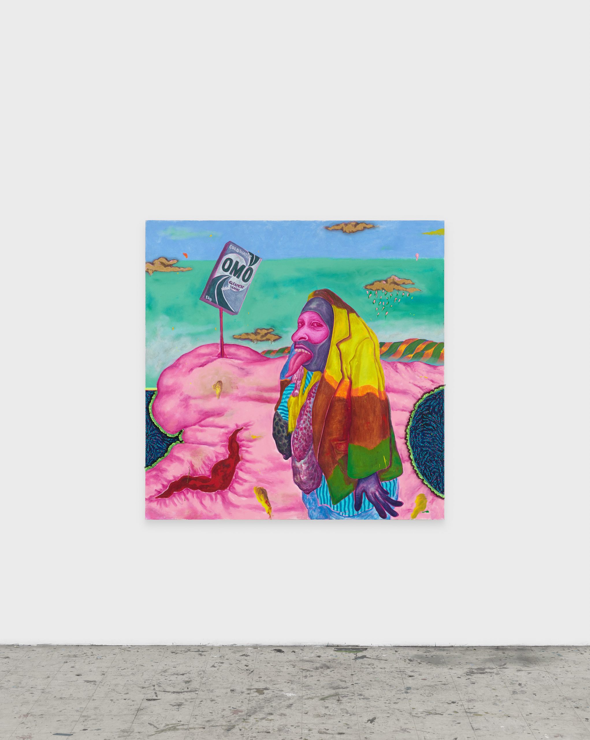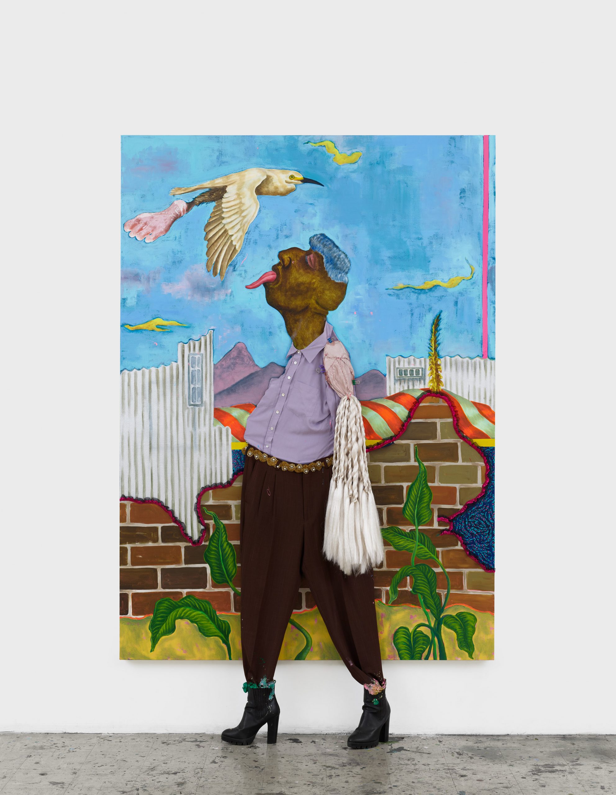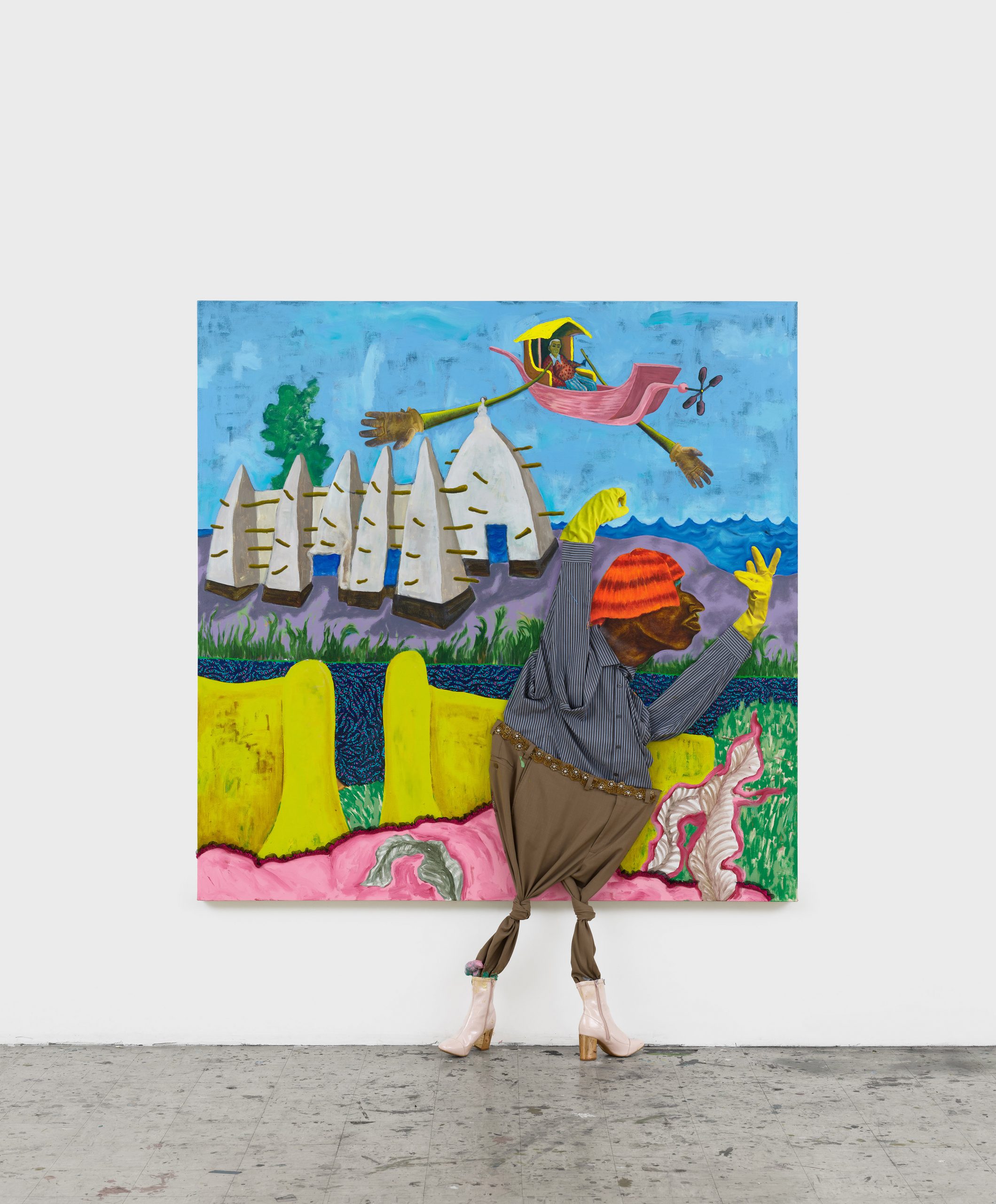 The mythology of witchcraft is the bedrock upon which Simphiwe Ndzube’s latest solo exhibition—THE FANTASTIC RIDE TO GWADANA—is based. In this show presented at Stevenson’s Johannesburg gallery, Ndzube brings together large-scale magical-realist paintings to contemplate indigenous belief systems around witchcraft and the idiosyncrasies of otherness. His genderless figures characterised by intricate costumes, play out their dramas against a backdrop of a strange and mysterious land. Although the title of the exhibition suggests something positively fanciful, the story of Gwadana is far murkier. Gwadana references a place in the Eastern Cape known as the mecca of witches where a large number of elderly women have been witch-hunted and persecuted. Much like the history of witchcraft itself, the story is complex. From views of witchcraft as a non-existent myth wholly dreamt up by “non-believing perhaps (god) unfearing heathens”, to it being a subversive practice reclaimed by those at the edge of societies — the witch is at risk of exclusion and death but the witch is also powerful and to be feared. She is unruly and unmanageable.