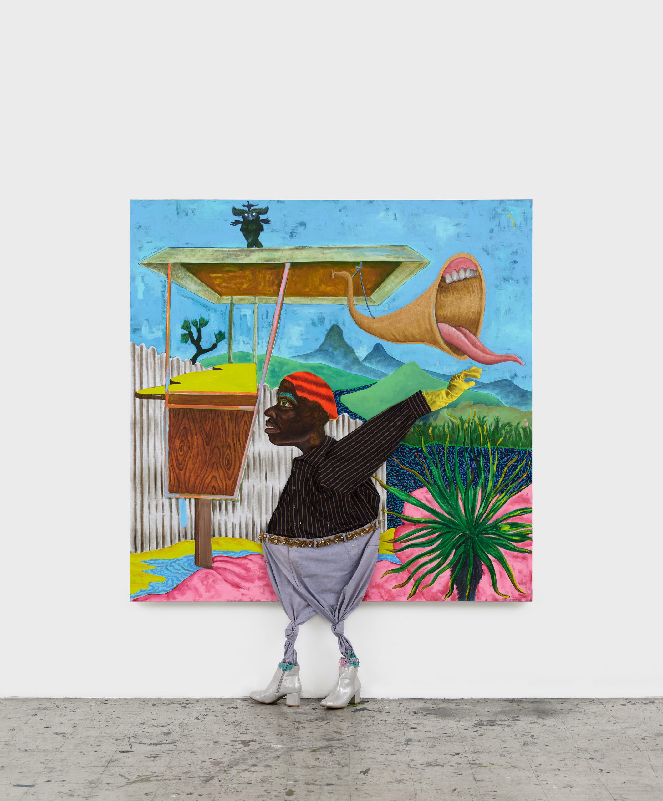 Mythology and myth-making are often central to Ndzube’s mode of creation. Writing about the artists first solo exhibition with Stevenson in 2019 (Uncharted Lands and Trackless Seas), Bongani Kona notes that Ndzube transfers meaning through “making the familiar strange”  adding, “Ndzube’s work breaks with cliches of language and form to say something new”. I would posit that just as he has previously made the familiar strange, in THE FANTASTIC RIDE TO GWADANA, he is making the strange familiar — after a while, we no longer ask why strings of hair protrude from armpits or why a trumpet bell resembles a mouth. In these magical worlds where fantasy meets reality, the boundary of what is possible is endlessly expanded.
