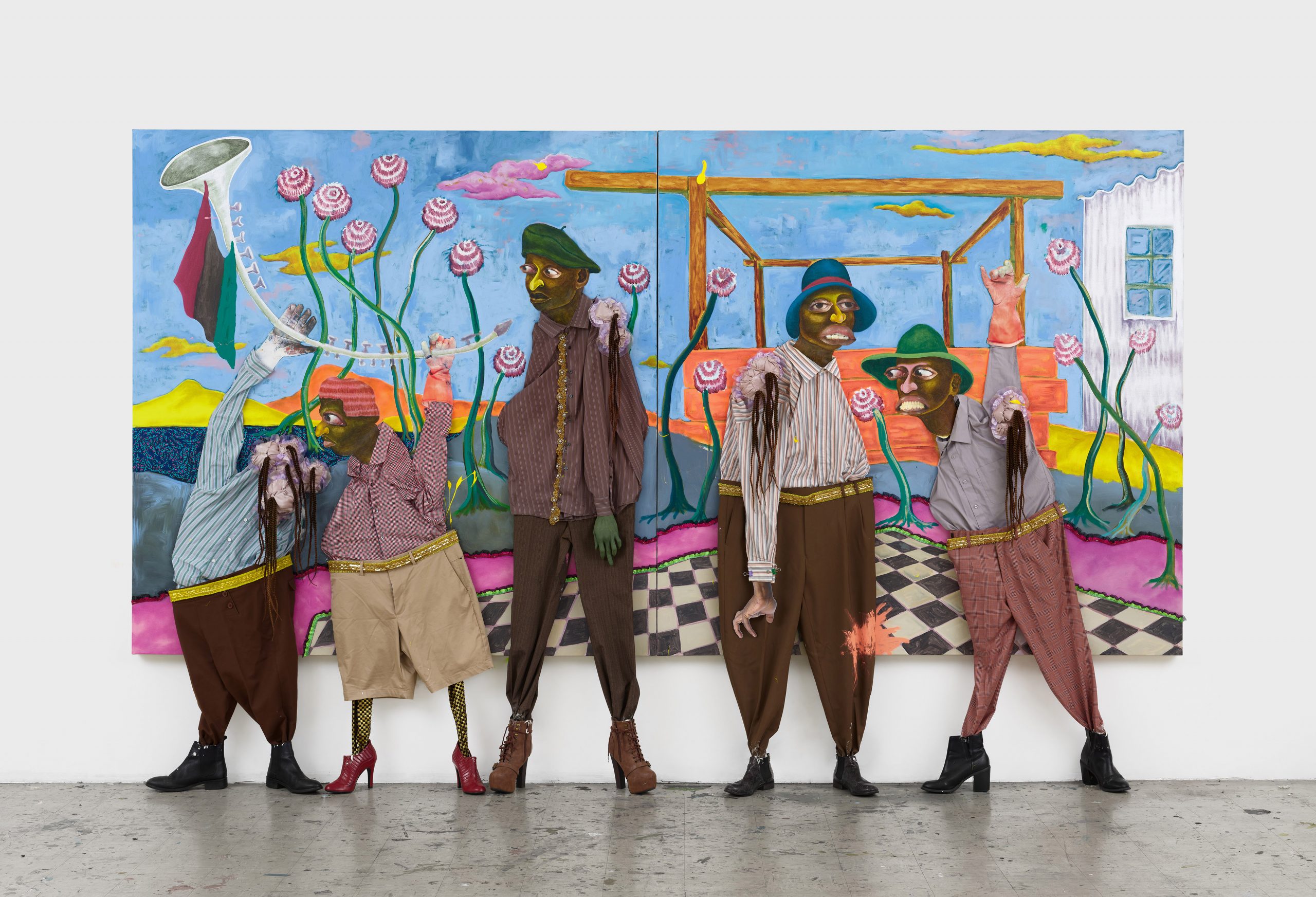 The mythology of witchcraft is the bedrock upon which Simphiwe Ndzube’s latest solo exhibition—THE FANTASTIC RIDE TO GWADANA—is based. In this show presented at Stevenson’s Johannesburg gallery, Ndzube brings together large-scale magical-realist paintings to contemplate indigenous belief systems around witchcraft and the idiosyncrasies of otherness. His genderless figures characterised by intricate costumes, play out their dramas against a backdrop of a strange and mysterious land. Although the title of the exhibition suggests something positively fanciful, the story of Gwadana is far murkier. Gwadana references a place in the Eastern Cape known as the mecca of witches where a large number of elderly women have been witch-hunted and persecuted. Much like the history of witchcraft itself, the story is complex. From views of witchcraft as a non-existent myth wholly dreamt up by “non-believing perhaps (god) unfearing heathens”, to it being a subversive practice reclaimed by those at the edge of societies — the witch is at risk of exclusion and death but the witch is also powerful and to be feared. She is unruly and unmanageable.