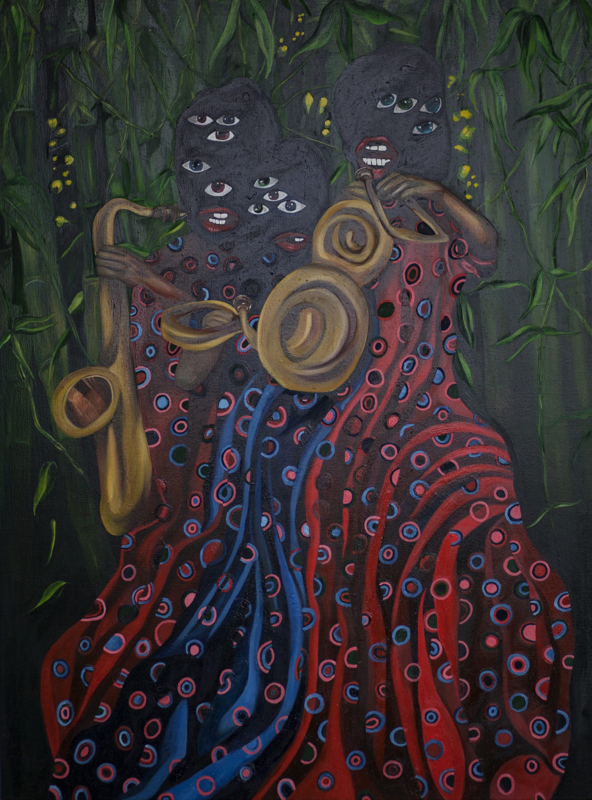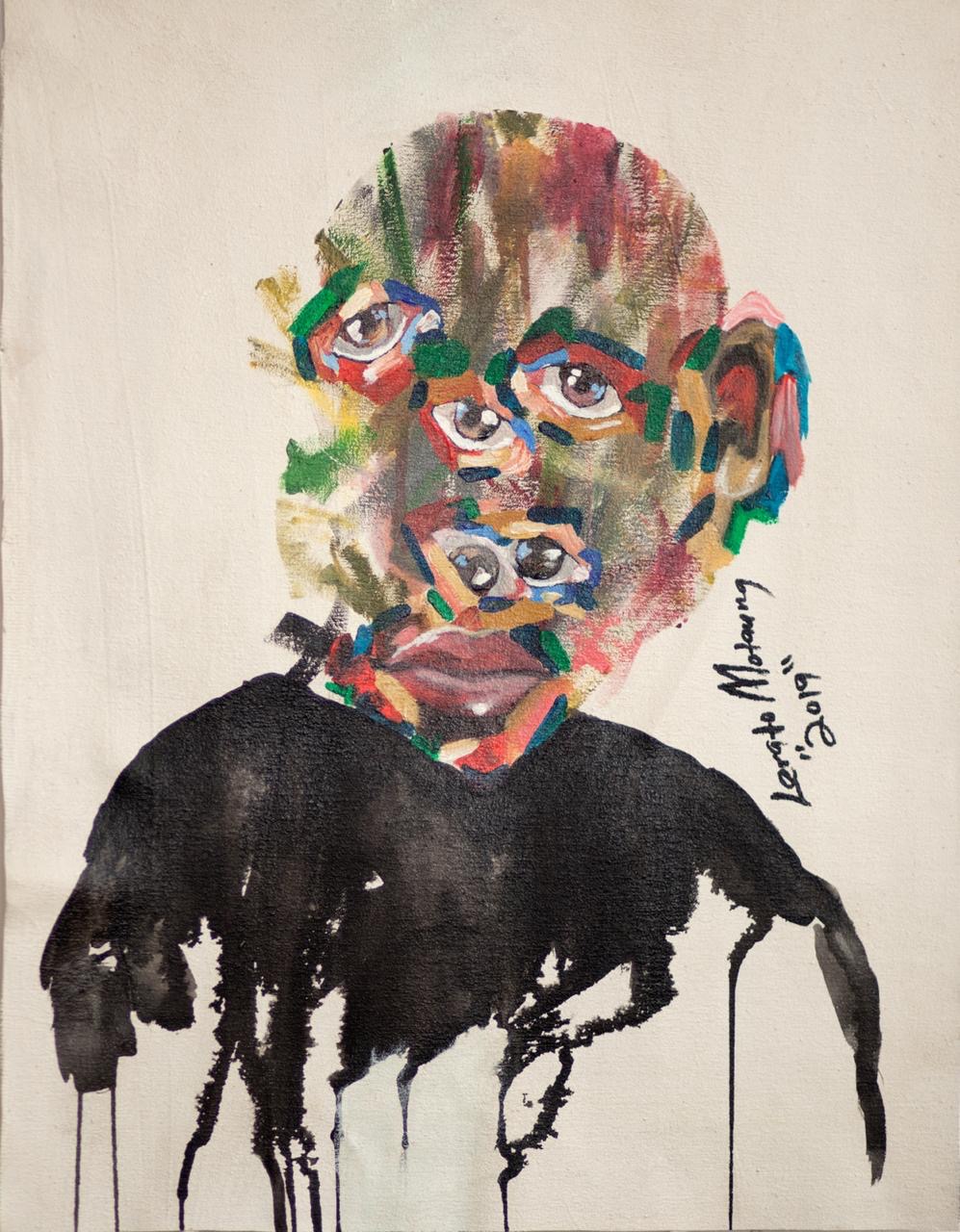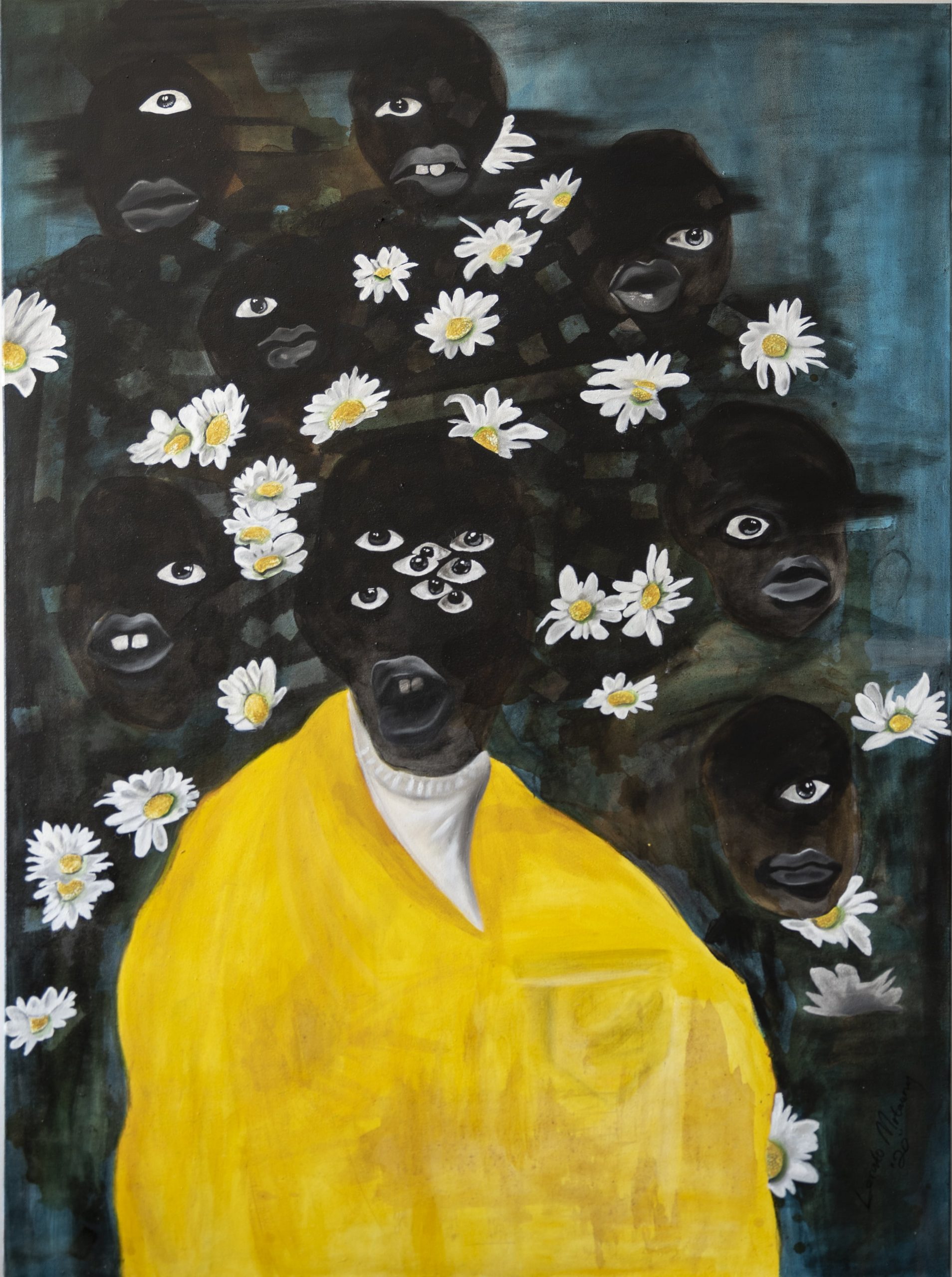 Describing his work as surreal, Lerato configures unsettling portraits and figures through distortion and his distinct use of faces with multiple eyes. Each eye indicates its own expression, pulling the viewer across a variation of emotional states in one face, leading to feelings of discomfort. The mouths on each face portray particular expressions too — pulling the viewer deeper into this emotional psychological whirlwind. And yet, each work has elements that soften this dizzying emotive spin. Sometimes its bright colours, as seen in Life is what happens or the scattering of daisies as seen in Day’s Eye. Lerato was born in Katlehong. He, however, spent most of his childhood in Rustenburg and was raised by his paternal grandmother and now currently lives and works in Johannesburg. All of these experiences at different moments in his life — including his time at TUT — lead him to explore his own memories. He thinks through these memories within the larger thematic frames of masculinity and patriarchy, trying to unpack how these terms have been defined and portrayed to him in different moments and places.
