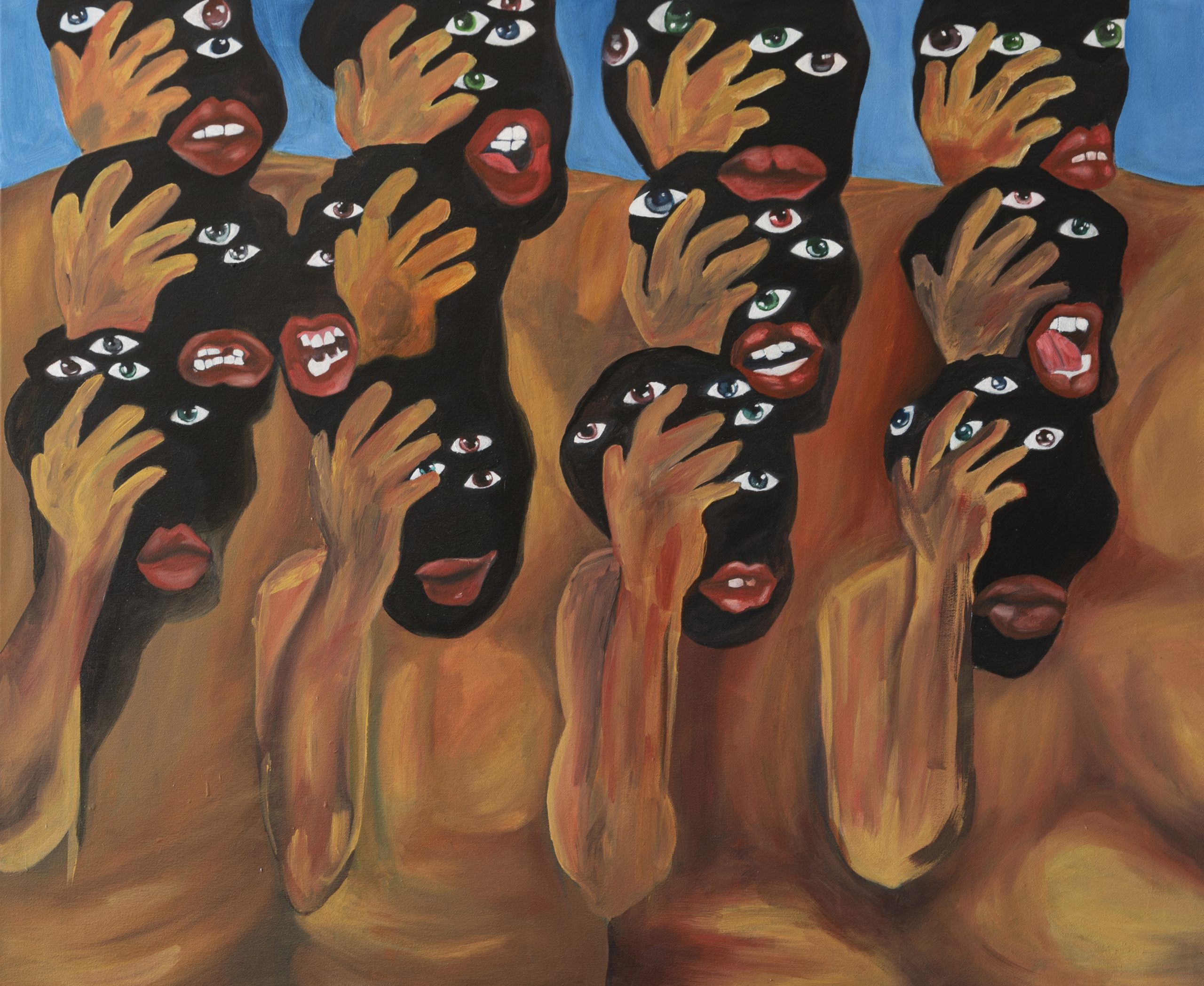 Describing his work as surreal, Lerato configures unsettling portraits and figures through distortion and his distinct use of faces with multiple eyes. Each eye indicates its own expression, pulling the viewer across a variation of emotional states in one face, leading to feelings of discomfort. The mouths on each face portray particular expressions too — pulling the viewer deeper into this emotional psychological whirlwind. And yet, each work has elements that soften this dizzying emotive spin. Sometimes its bright colours, as seen in Life is what happens or the scattering of daisies as seen in Day’s Eye. Lerato was born in Katlehong. He, however, spent most of his childhood in Rustenburg and was raised by his paternal grandmother and now currently lives and works in Johannesburg. All of these experiences at different moments in his life — including his time at TUT — lead him to explore his own memories. He thinks through these memories within the larger thematic frames of masculinity and patriarchy, trying to unpack how these terms have been defined and portrayed to him in different moments and places.