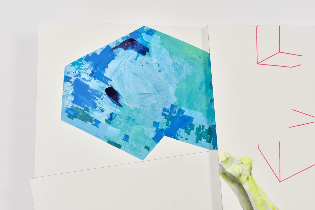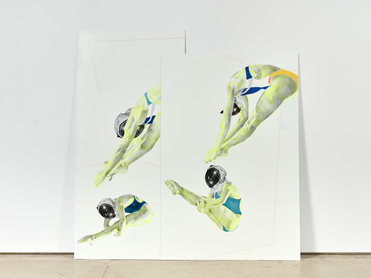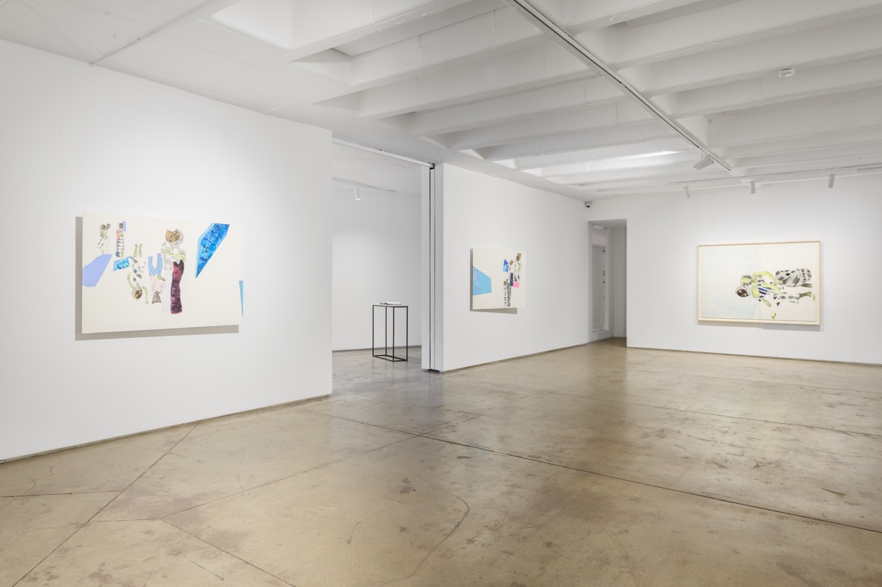 She’s also become increasingly interested in the idea of a swimming pool, which has recently emerged as a recurring object in her practice. This piece, for example, is site-specific, created according to the gallery’s dimensions. It consists of three panels, with a deliberately loose hanging meant to mimic the movement of water.”