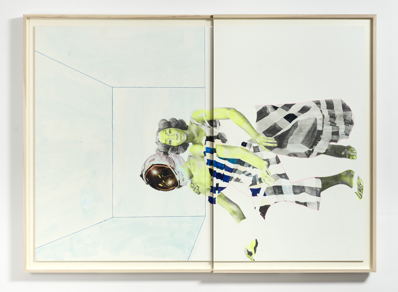 While each shift in composition may seem minor, collectively they create a disorienting and reorienting experience for the viewer, influencing how the artworks relate to the exhibition space. amanze’s characters and the various forms, engaging materials such as graphite, ink, and photo transfers, almost seem to be in some abstract battle with the emptiness that surrounds them. What’s at stake is the age-old tension between form and function, with the show adding tricky nuance to what it means to be a Black femme painter in an ostensibly white world.