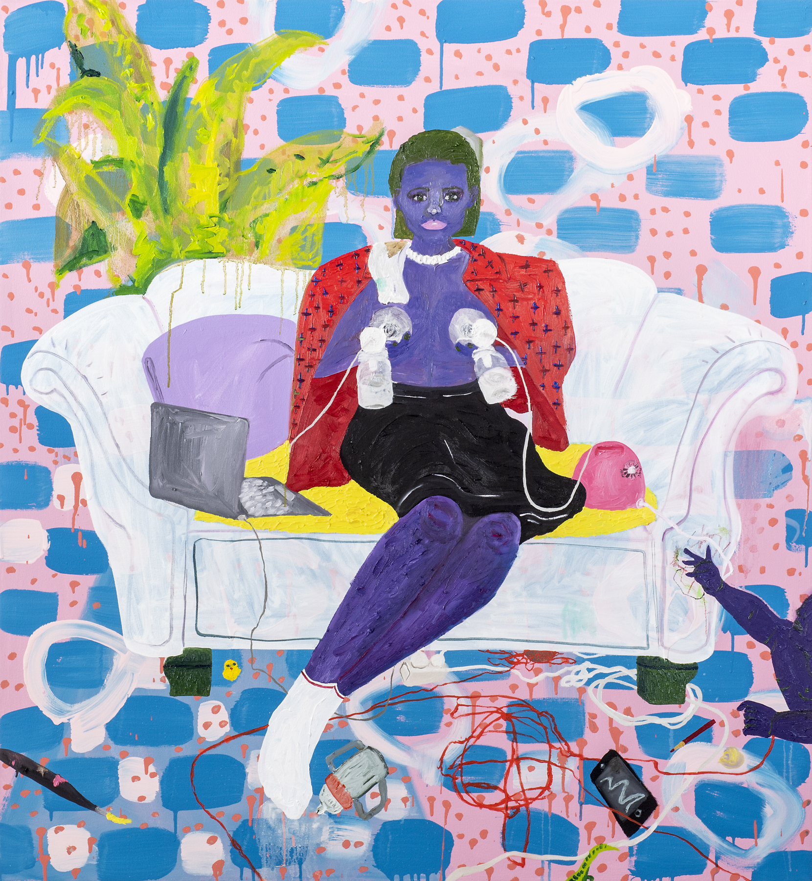 MOTHER IS A DRUM is a solo exhibition by Grace Cross at SMITH. The show deals with the birth of the artist’s child and the solemn epiphanies of motherhood. Making use of symbols in her paintings, the viewer is confronted with images of famished mouths, a woman with breast pumps–reminding one quite starkly of the image of Rachel McAdams on the cover of Girls. Girls. Girls magazine­–as well as images of mushed up food and leaking breasts. Her paintings leave traces of ambiguity containing odd comparisons and uncomfortable smiles. Every object presented within the frame of the canvas are given the status of a talisman. Such objects include a spoon, a toy and a showerhead. By granting them this talismanlike stature the objects become injected with ritualistic power and carry what Lucienne Bestall refers to as “psychic weight”. The symbols Cross works with are given life through the associations that are connected to them. As Bestall notes, “For Cross, the inanimate animates even while it keeps its stillness; it produces effects, it inspires engagement.”