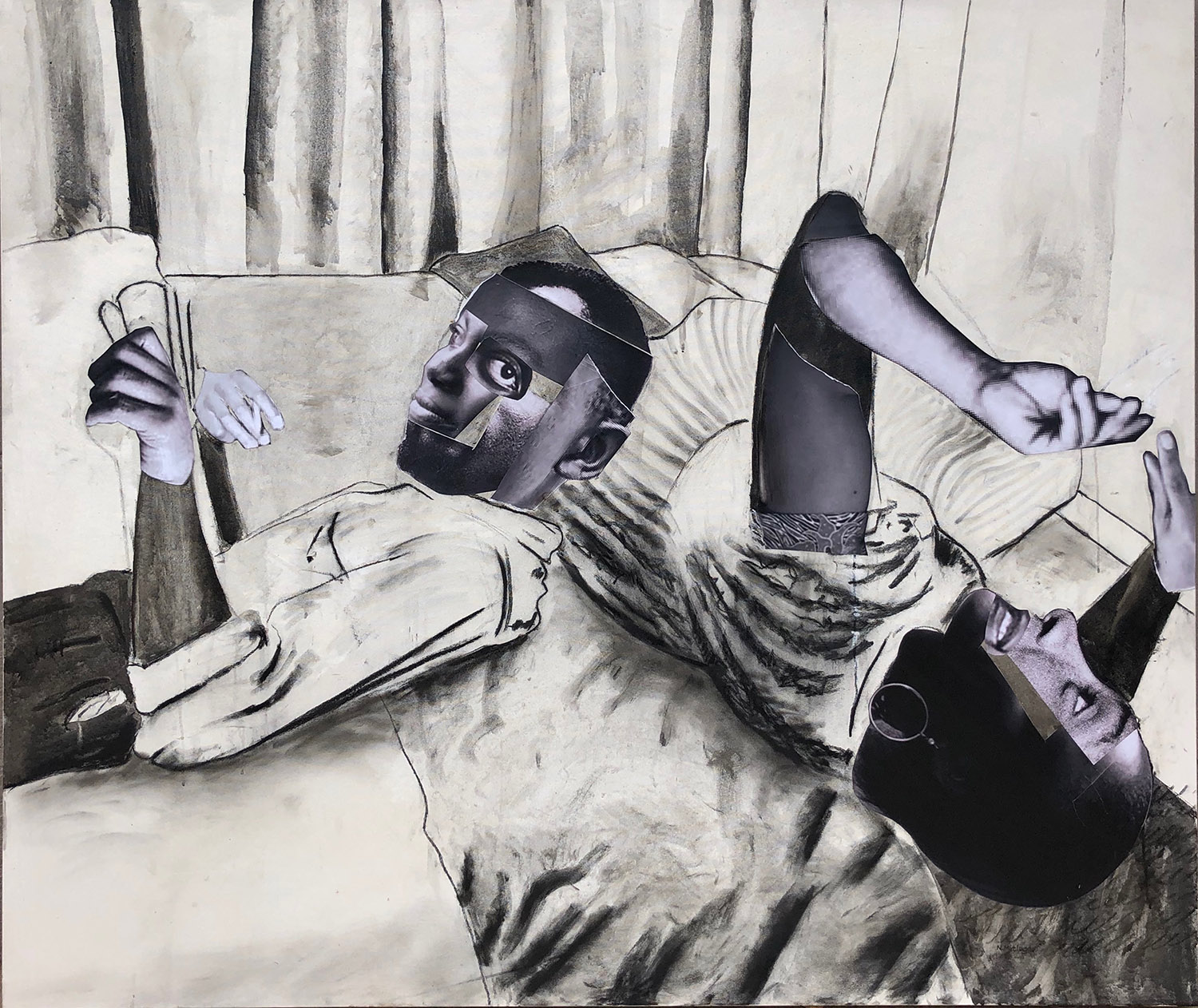 The use of mediums that can easily smudge and that leave traces despite attempts to be erased is significant when linked to his explorations of home spaces and social life. These traces are evidence of existence, of a mark having been made albeit now faded and slightly unclear. This mirrors what is present in this series of works; life and living. This relationship between medium and the emotive depictions of people in a bedroom, the kitchen, the sitting room, the stoep — highlights Matloga’s holistic understanding of building storylines. Each scene holds a recognisable element, prodding at the viewer’s memories, making the characters presented in the work feel familiar. His use of collage, particularly for the figures’ faces, layers components of legibility. “In my collage paintings, the figures refuse to solidify into simply drawn or painted material; there is a living presence there on the canvas that cannot be looked away from,” Matloga expresses. Through collage, the figures can take on the experiences and emotions that viewers think back to while also taking on personalities of their own.