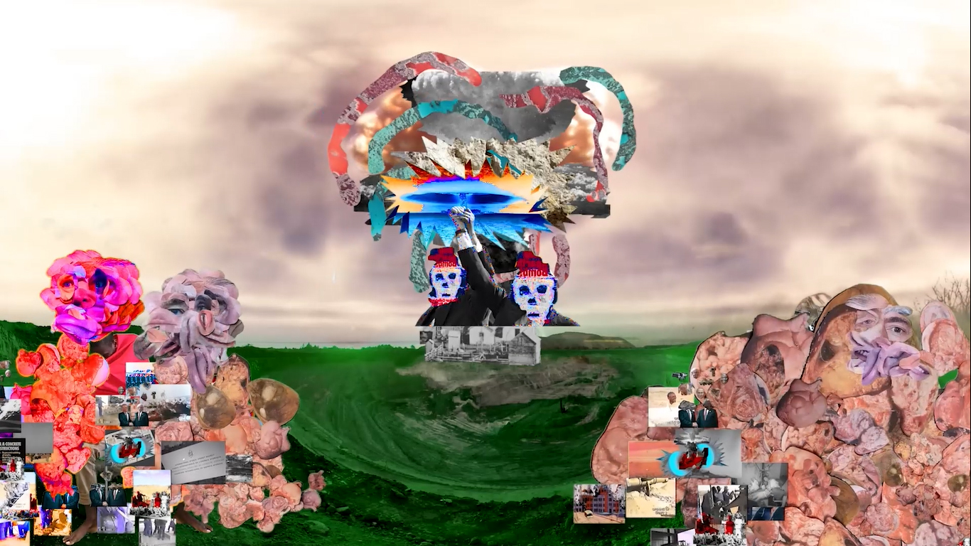 A rhizomatic tapestry of archival research, dramaturgy and visual strategies associated with video art, collage, sculptural installation and VR.