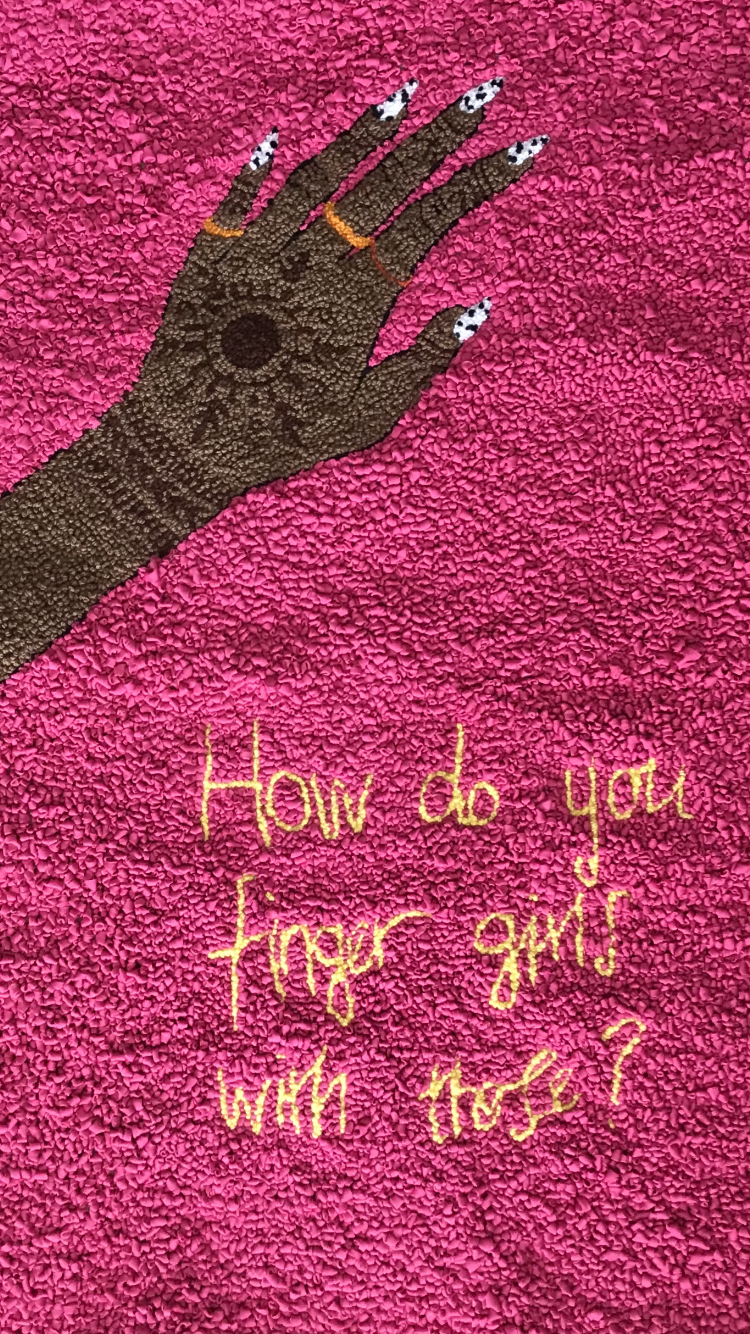 Video, performance and installation are also integrated into her practice, with Talia expressing that her work needs to be experienced in real life. For her, the tapestries draw the viewer in with their familiar softness, but upon closer interrogation they become vehicles for narratives that express the unique intersections faced by the femme South Asian community. “South Asian narratives have been underrepresented in art spaces across South Africa. I have an important story to share and hope this will reach more people that look like me and encourage them to engage with art-making practices,” she shares. Trans-generational trauma is a central theme in her work; with a particular interest in how coping mechanisms and responses to long-term subjugation are passed on and the consequences of this in an individual’s life. “My work attempts to break the cycle of previous behaviours by acknowledging them and actively trying to redress past wounds. My practice is centred around healing. Firstly, for myself as the experience of making the works is an act of healing. And secondly, through bringing this idea of confronting past traumas and living in one’s truth to my own community,” Talia expresses. Her work attempts to depict the full scope of her own experience and that of a shared experience—subverting stereotypical readings of womxn of colour. Re-directing this, her work becomes acts of reclamation, disruption and moments to take ownership of her own narrative.