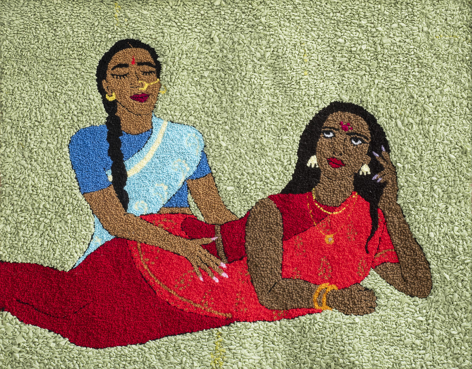 Tapestry artist and Kutti Collective member Talia Ramkilawan‘s recent artwork captures seemingly ordinary everyday moments—creating a textured archive. At first the images of womxn depicted in her work were sourced from her imagination, but as her practice developed she found inspiration in photographs from her childhood or her friends. Contemporary scenes demonstrate her desire to immortalise memories and the influence of the digital world through composition and subject matter. Seeing these scenes through the medium of tapestry encourages a moment of reflection and alternative viewing. Talia was drawn to weaving as a way to find a process of healing through the act of making, as well as the desire to find an intimacy between her work and herself. “Weaving, working with wool and cloth is typically associated with womxn’s work and I found it so intriguing that I would be doing something internally so powerful and disruptive with regards to my healing just by sitting in my apartment playing with wool all day,” Talia shares. The process of making work is as much about contemplation and understanding as it is about producing an art piece. “My work also explores the intersections and binaries of my lived experience as a queer Indian womxn. Indian, yet not Indian enough, a daughter, a friend, queer, brown, tired yet so much more to give.”