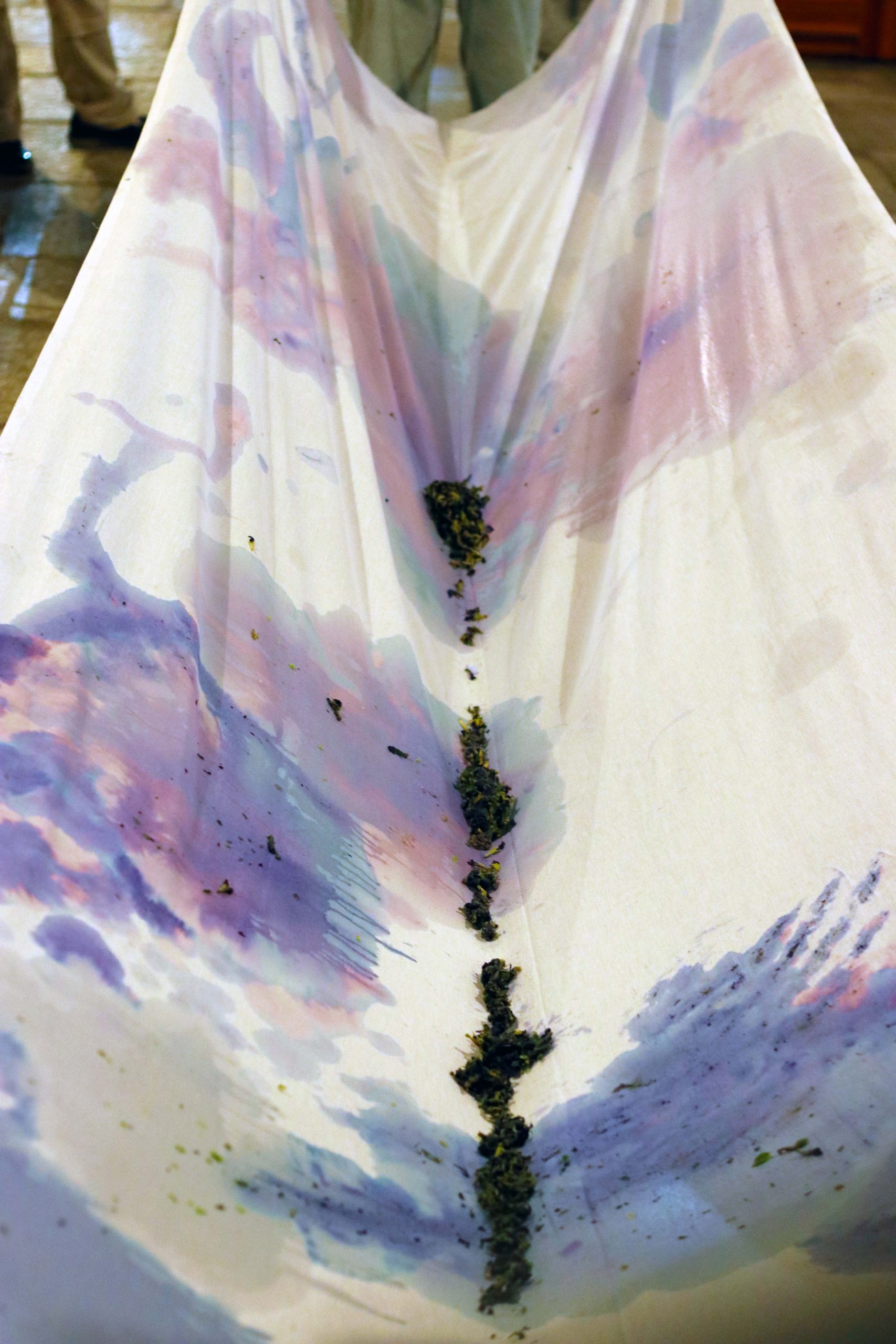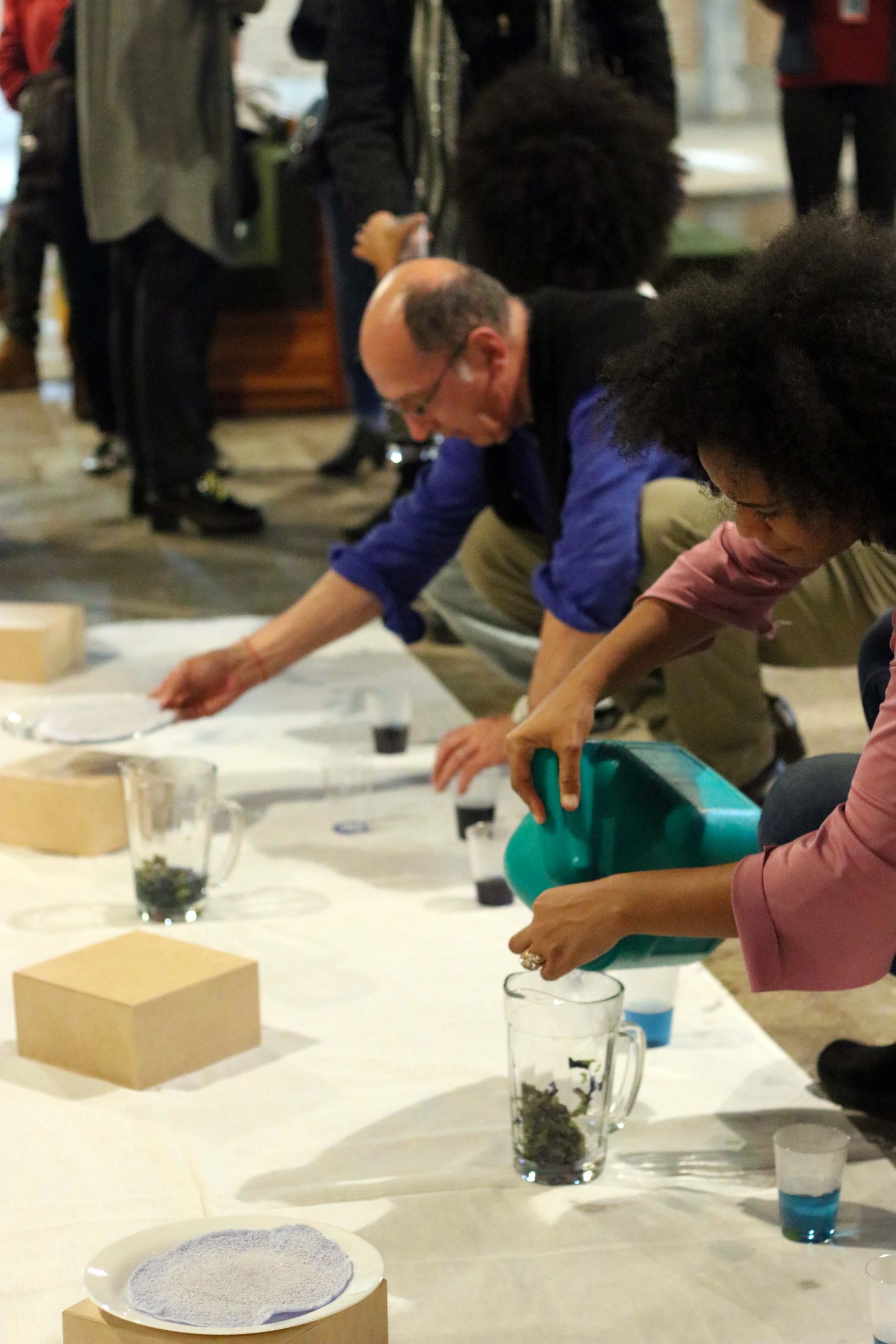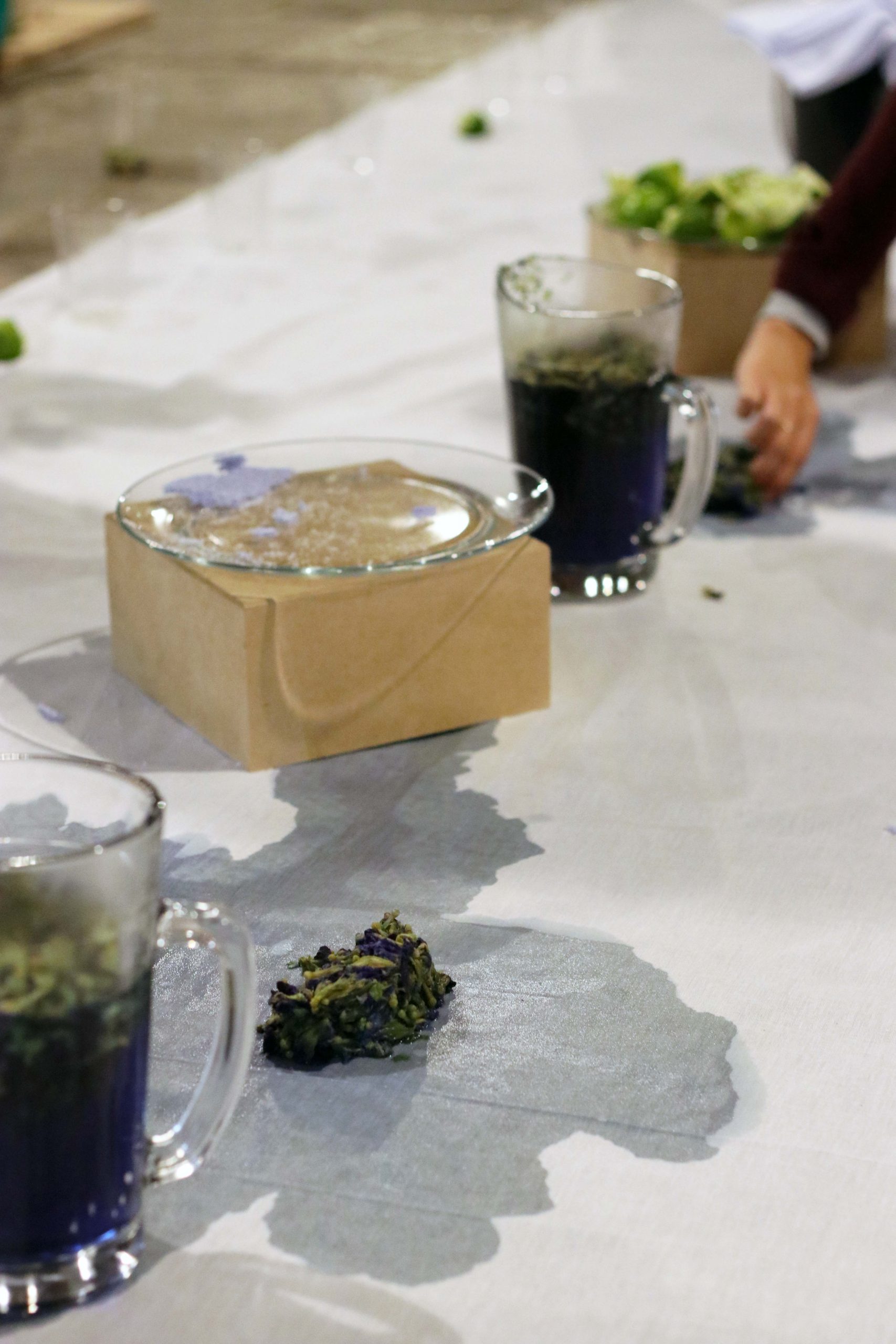 Between Blue and What They Don’t Let Me Forget, was my first individual show in Brazil and it is an interactive installation in which blue is an activated presence for the presence of people in space. As the public enters the room the blue tones of the lights intensify and at the same time trigger an audio with my voice in a text elaborating on my blue experiences. All collected in performances in which I invite people to eat and drink the blue of the Clitoria Ternatea flower.