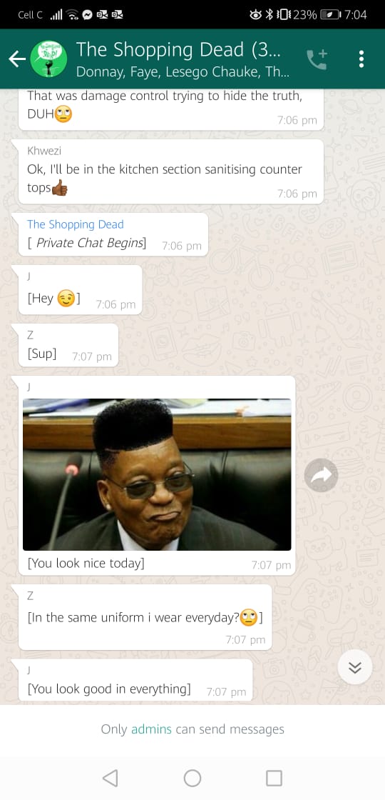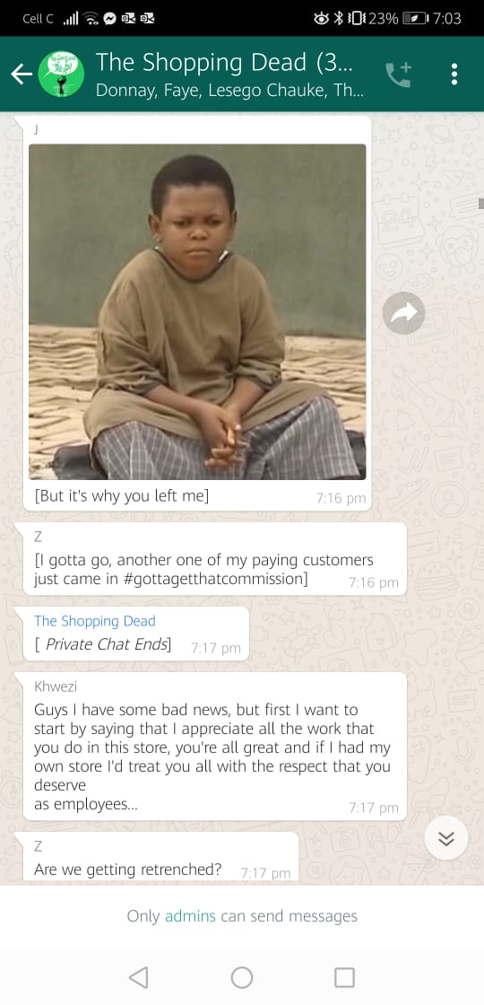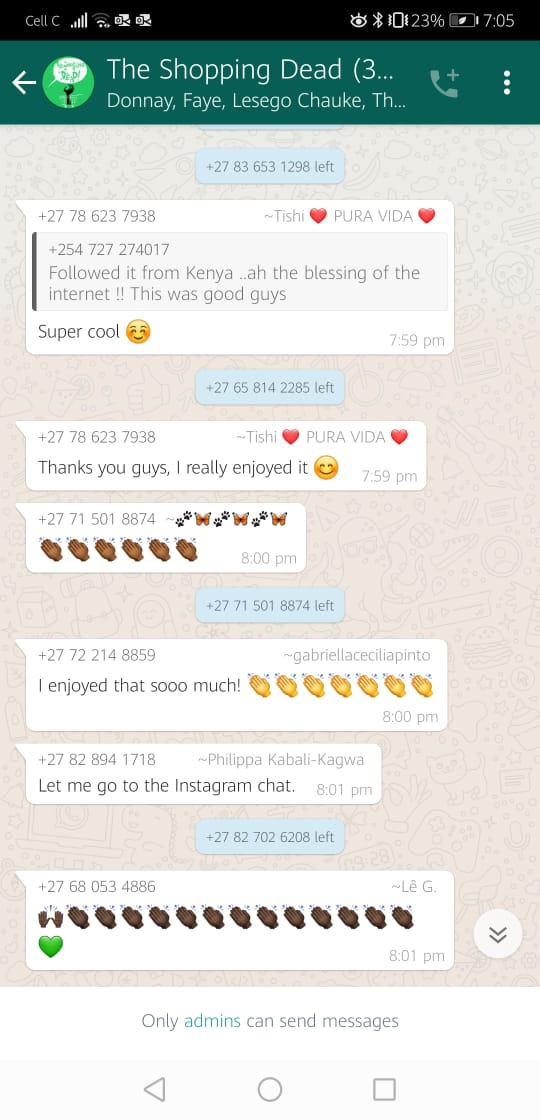 This is definitely not the end of The Shopping Dead, or me playing around on the WhatsApp platform. We are currently putting in proposals to develop The Shopping Dead further and will hopefully be doing an independent run of the production very soon, Faye states. Keep an eye out for these development later in the year.