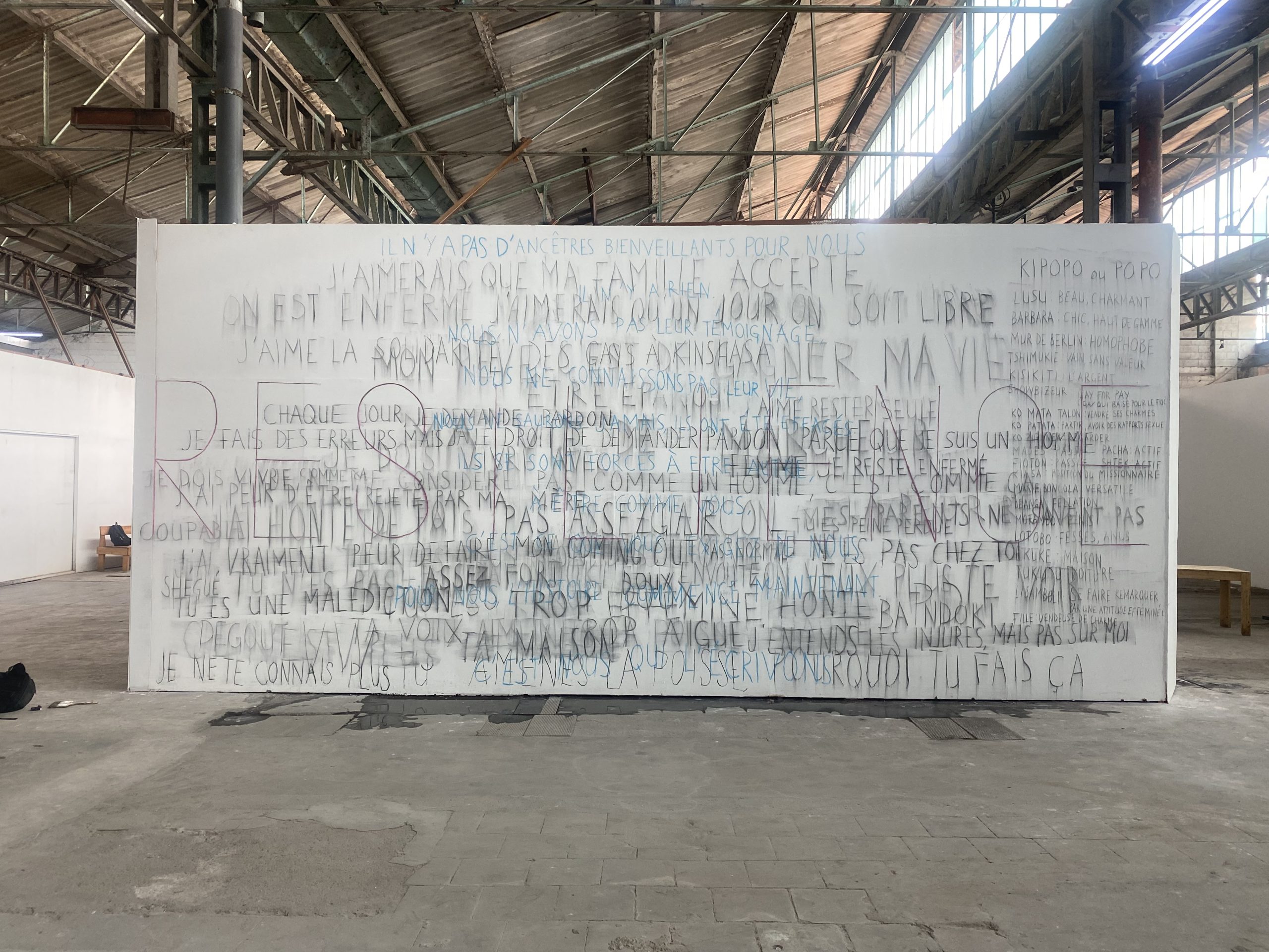 For Résilience, Marc Bauer took a deep dive into the politics, history and memories of the LGBTQI+ community of the DRC. He did this by taking a research trip earlier this year to the bustling capital city of Kinshasa in March of this year. Over his trip, he visited Kin ArtStudio, which would be hosting the works of international artists for the Biennale. It would later be on one of the large walls of Kin ArtStudio that Bauer would produce the large-scale, text-based drawing that is Résilience.