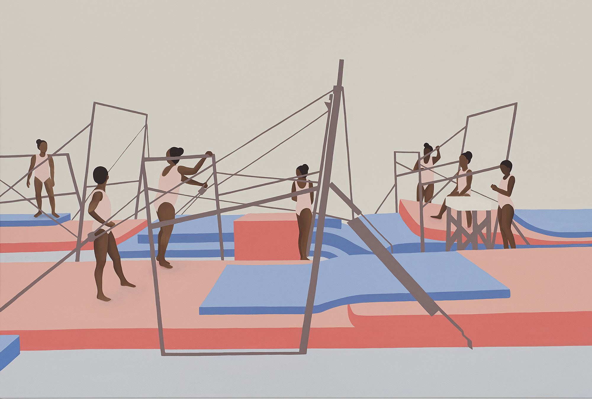 In her first solo exhibition with Stevenson Gallery —Gymnasium—Nkosi returns once again to the impossible questions of voice, power and agency through a series of oil paintings and video work. In this exhibition, the architectural is stripped down to its most elemental form; the line. Straight lines and sharp angles depicting the interior of a gymnasium exists alongside smoothly rising, and falling outlines of bodies in space. The gymnasium functions as a metaphor for how artists — particularly Black artists — navigate traditionally exclusionary and oppressive systems within the (art)world. In Team (2020), something important has just happened, possibly a fumble or maybe a victory; two figures are embracing, another’s hands are covering her eyes, the rest of the team is gathered. On the far left of the painting, we see a gesture, a woman mid-clap. All the while- the unrelenting gaze of the camera hovers above this moment. We get a sense of the heaviness that comes with looking and being looked at.