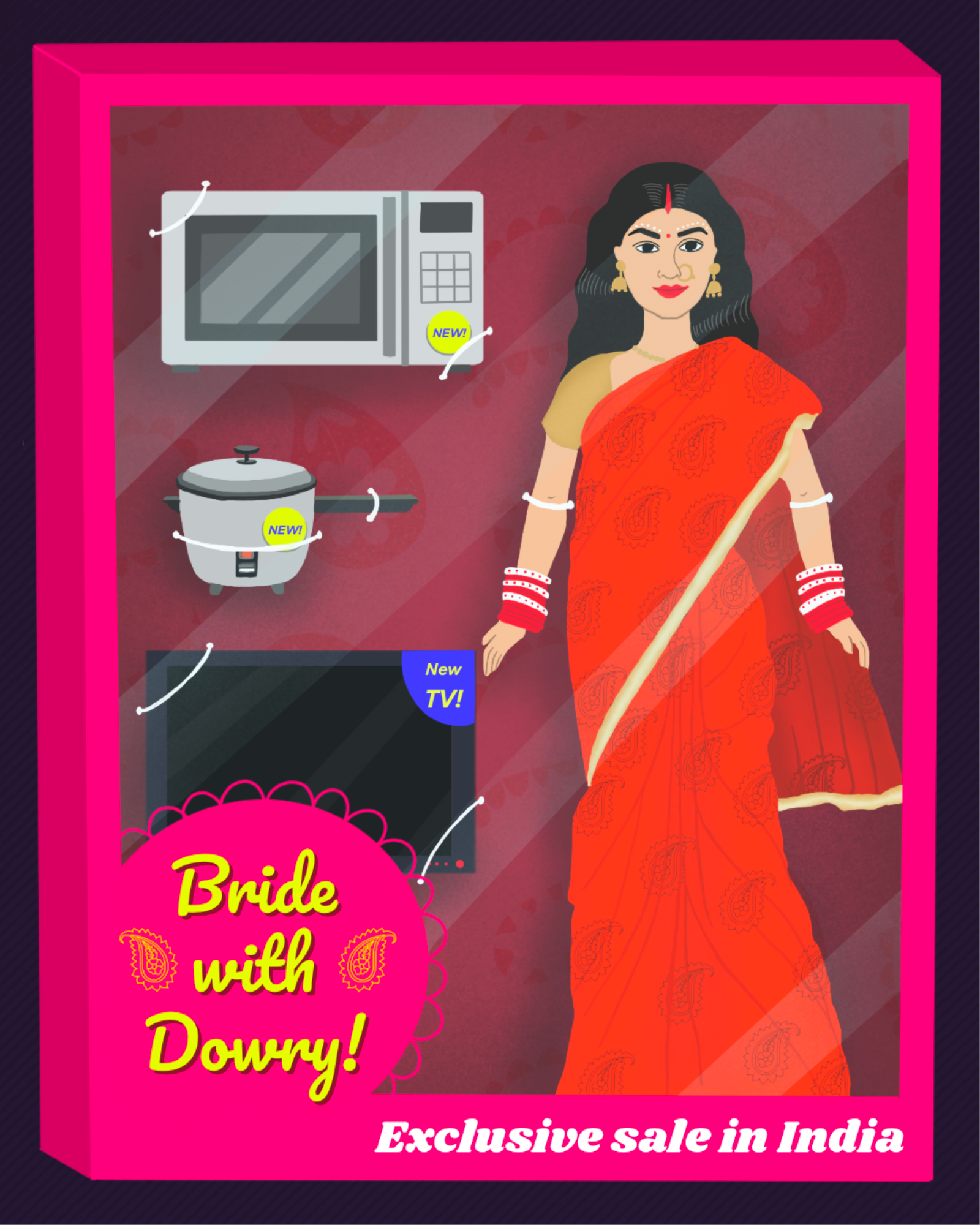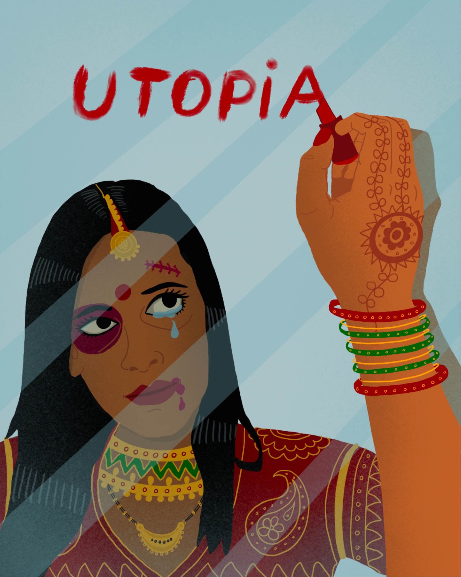 “In India, marriages are breaking like biscuits,” says our favourite matchmaker Seema Aunty a fact that rings true here as well, yet remains a fact that many people in the Indian community will brush over without facing the unfair realities of many Indian marriages. I am drawn to Smish’s work as they present these issues through well-illustrated artworks. One of which portrays a ‘Bride with dowry! Exclusive Sale in India’ well equipped with a microwave and pressure cooker that speaks not only to the objectification of the Indian bride but also is a reference to the dowry system in India. A system in which the family of the bride gives “gifts” or money to the groom and his family and which is now illegal but still sees for many dowry deaths— deaths of married women who are murdered or driven to suicide by continuous harassment and torture by their husbands and in-laws over a dispute about their dowry. Another work shows an Indian bride with a black eye painfully writing the word “UTOPIA” across a mirror in red lipstick—a reference to the increase in domestic violence Indian femmes have reported during the COVID-19 pandemic as lockdowns have caused femmes to be trapped within abusive households.