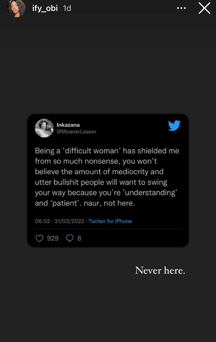 Screenshot of Instagram story by writer Ify Obi.