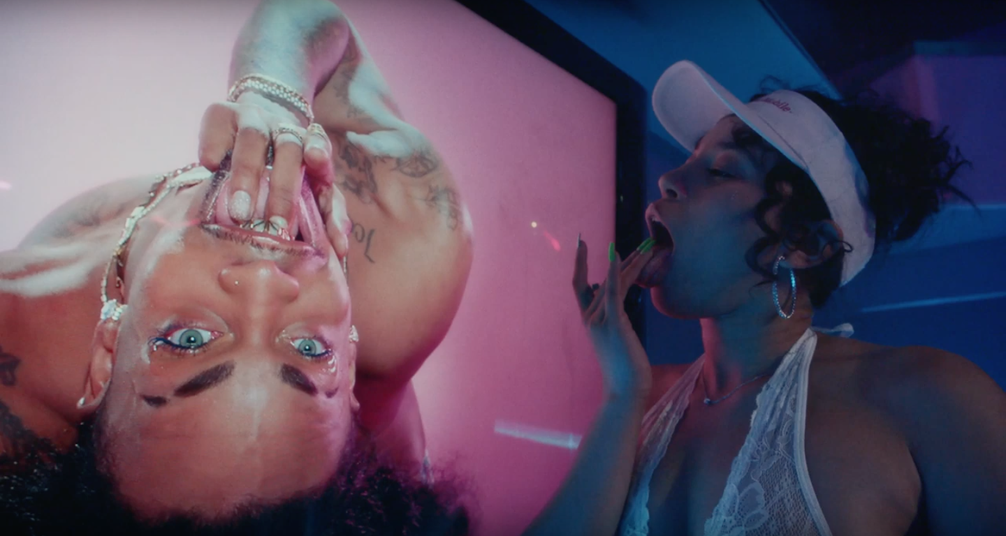 The video for “Persistent” opens with a woman who works for Shugga Mobile (a re-vamp of T-Mobile) walking down a Brooklyn street past a strip of bodegas, bakeries, liquor stores and quick-cash markets. She enters an empty room in a porn shop, sits down on the table, picks up a remote control and presses ‘6-9’ with her neon green acrylic nails. The TV switches on and Ian Isiah’s big blue eyes open on the screen. An NSFW strip tease session ensues. Isiah is up against a pink background, performing for this woman: they are all gold grills, tattoos, lip gloss and inches. “Tryna get some pussy in this bitch- got that henny on deck” they repeat in autotune over and over and over. As they sing on screen, she undresses herself to this song, taking off her work clothes to reveal white lingerie. Isiah seems to be directing her for a lot of it, as she moves around the room, touching herself on the couch and then on the table while they watch each other. Isiah put’s their own silver painted fingertips in their mouth, and she mimics the motion. She straddles the table and looks up at them adoringly. In the last few moments, she’s wining her waist and twerking on the table, still gazing at Isiah and she starts to tear up.