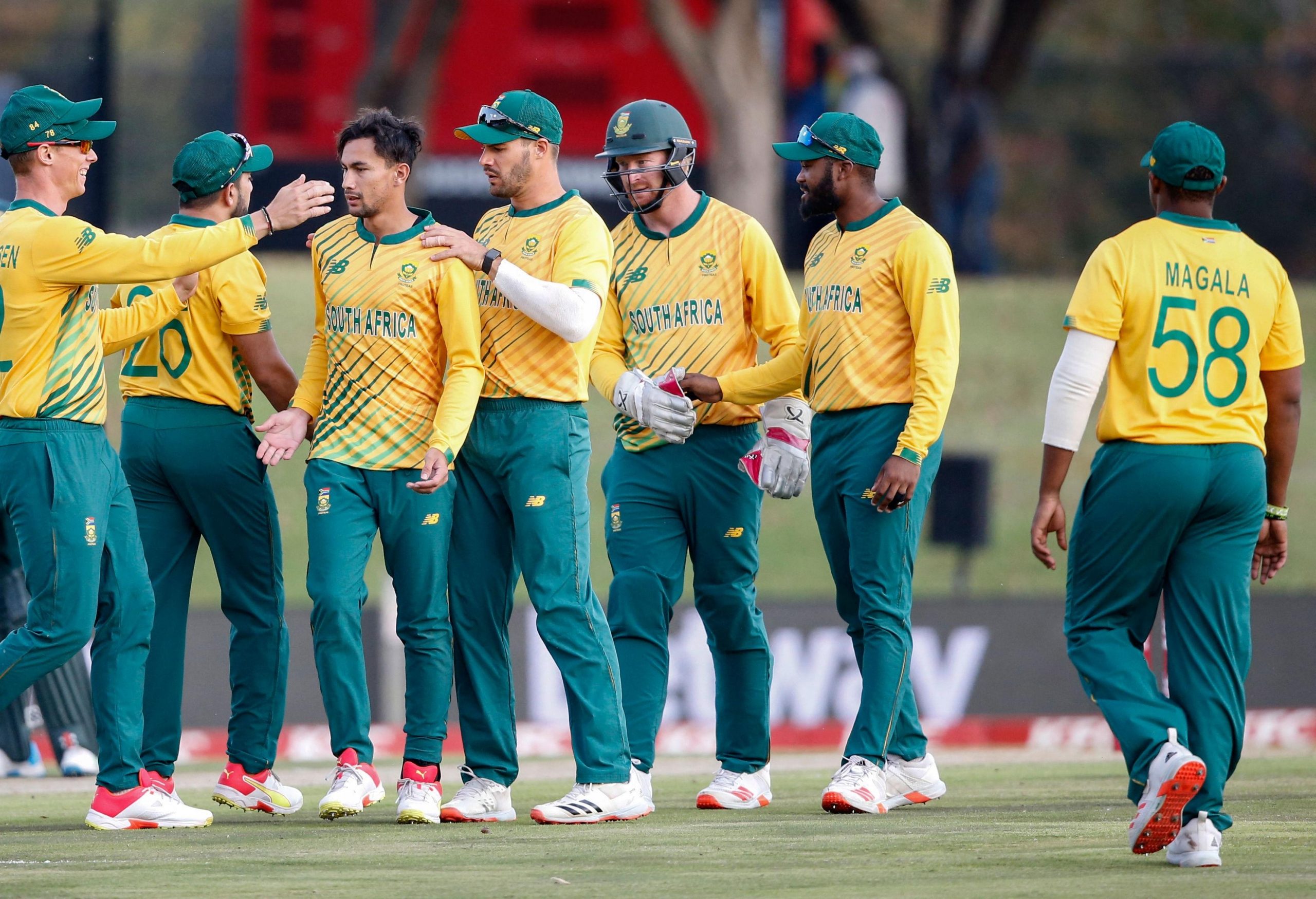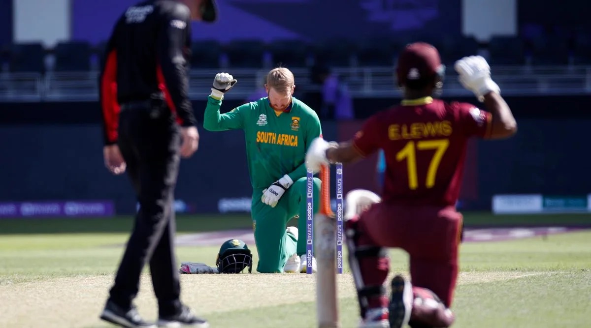 Before the match, the entire Australian team bent their knees in unity as a gesture against racism, while the South African team stood as a scattered front with all its black and brown players — and one white player — kneeling in support of the cause, while the other players stood with their fists raised as a partial symbol of support, and lastly with de Kock and Heinrich Klaasen, who decided to stand with their hands tied to their backs.