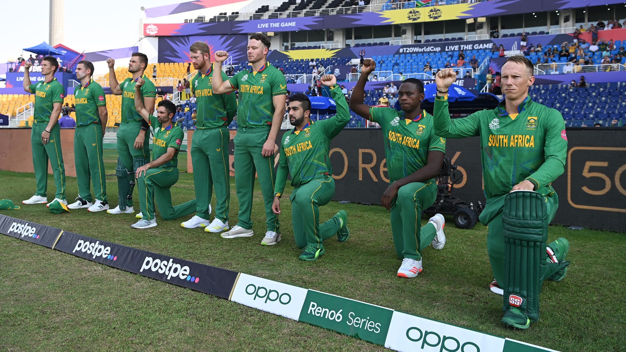 Before the match, the entire Australian team bent their knees in unity as a gesture against racism, while the South African team stood as a scattered front with all its black and brown players — and one white player — kneeling in support of the cause, while the other players stood with their fists raised as a partial symbol of support, and lastly with de Kock and Heinrich Klaasen, who decided to stand with their hands tied to their backs.